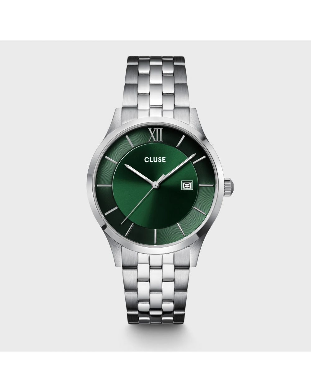 Cadran: Couleur verte avec une finition en soleillage. Les index des heures sont des bâtons argentés, à l'exception du chiffre romain "XII" à 12 heures.