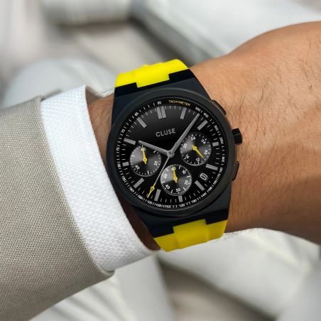 Cette montre se distingue par son look audacieux et énergique grâce à la combinaison du noir et du jaune. Elle est parfaite pour les activités sportives et les tenues décontractées tout en offrant des fonctionnalités pratiques telles que le chronographe et le tachymètre. Son design moderne et son bracelet en silicone en font un choix idéal pour ceux qui recherchent une montre robuste et élégante.