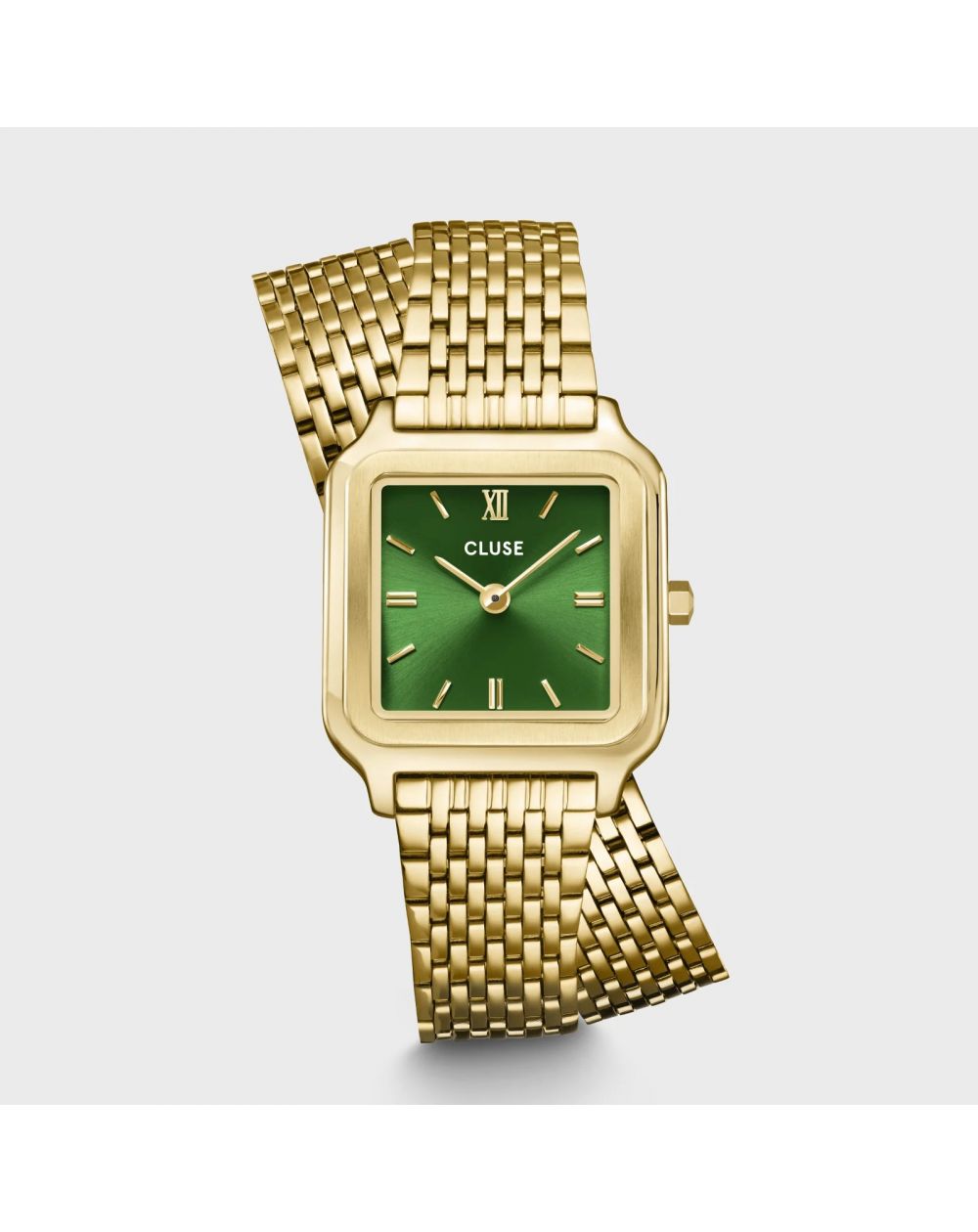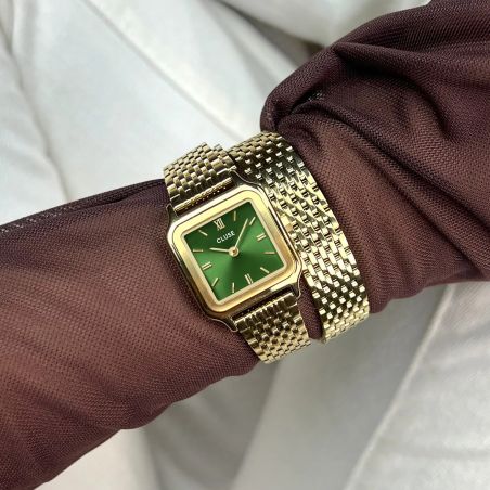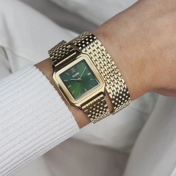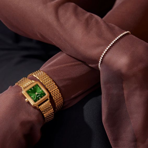 Découvrez la montre Gracieuse Petite pour femme, désormais sublimée par un détail élégant de double bracelet. Dotée d'un boîtier de 24 mm couleur or, cette montre encadre avec grâce un cadran vert forêt, créant un contraste saisissant qui ne manquera pas de captiver les regards. Le double bracelet en acier inoxydable de 14 mm, également doré, confère une touche luxueuse à cette pièce, la transformant en un véritable bijou. Que ce soit pour une soirée spéciale ou pour rehausser votre look quotidien, la montre Gracieuse Petite incarne à la fois style et sophistication. Polyvalente, elle permet de personnaliser facilement son apparence avec n'importe quel bracelet de 14 mm, et son ajustement est simple à réaliser soi-même pour un confort optimal.