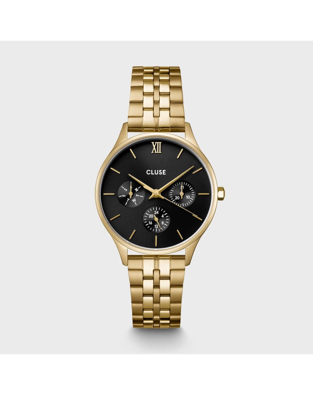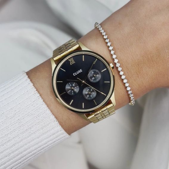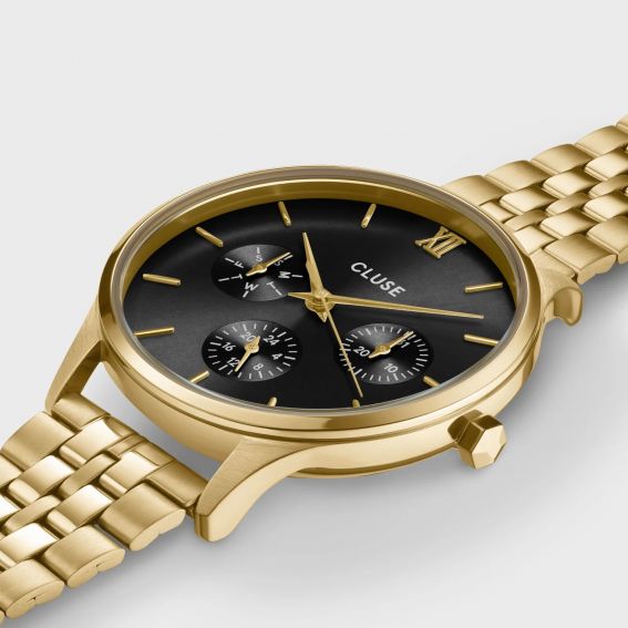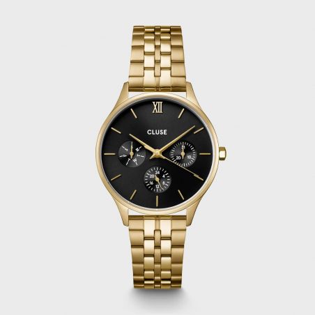 Ajoutez une touche de style et de sophistication à votre quotidien avec la montre Minuit Multifonction pour femme. Dotée d'un boîtier rond de 34 mm dans une élégante teinte dorée, cette montre s'accompagne d'un bracelet à 5 maillons, offrant à la fois robustesse et confort. Son cadran noir contraste magnifiquement avec le doré, tandis que les trois sous-cadrans vous permettent de suivre le jour et l'heure avec précision.
