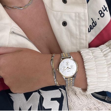 - Boîtier élégant : Acier inoxydable bicolore (or/argent) avec une forme ronde et un diamètre de 34 mm, pour un look raffiné et intemporel.