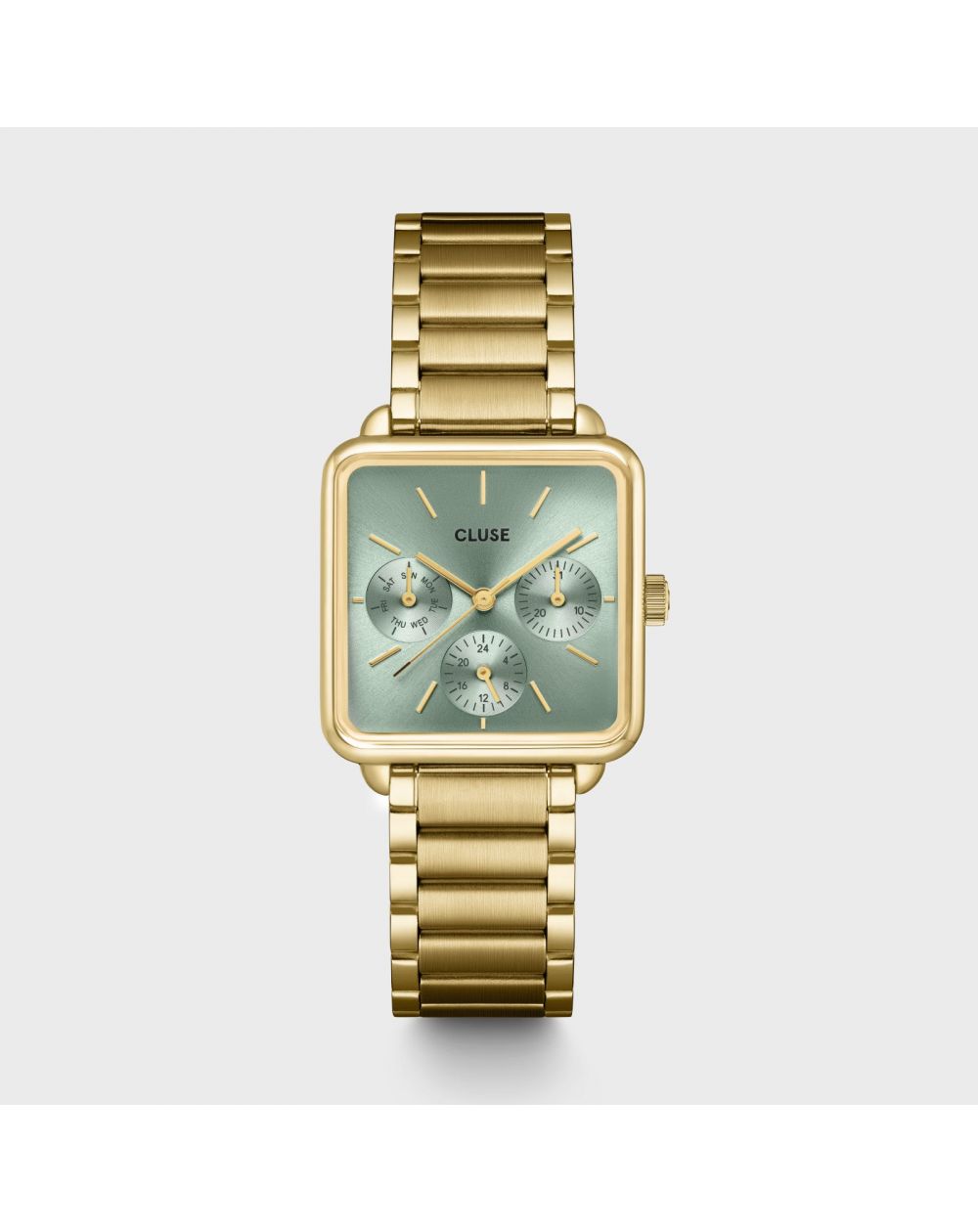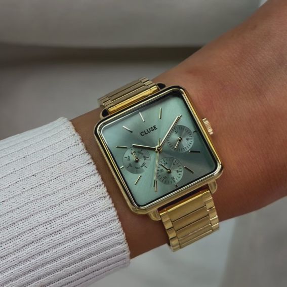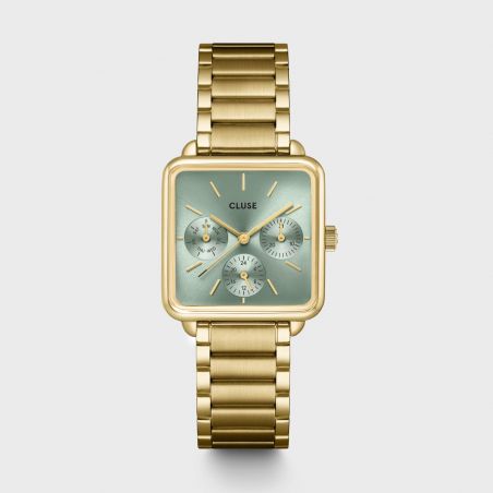Rehaussez instantanément votre style avec la montre La Tétragone Multifunction pour femmes. Dotée d'un boîtier carré doré de 30 mm, cette montre élégante se distingue par son bracelet à trois maillons et son cadran vert sauge, complété par trois sous-cadrans pour le jour. Personnalisez-la avec n'importe quel bracelet de 16 mm et ajustez facilement la taille pour un confort parfait. Un must-have pour allier fonctionnalité et chic au quotidien.