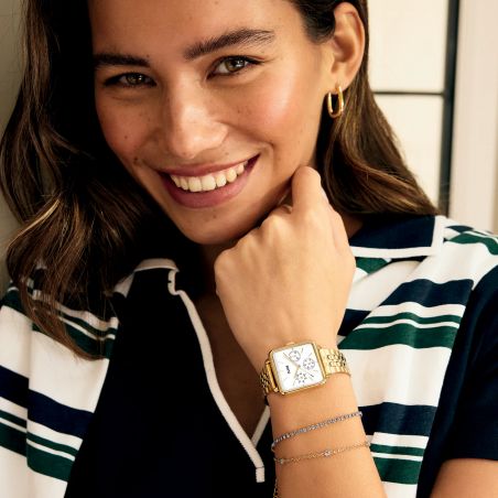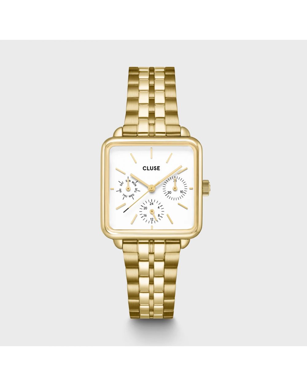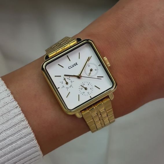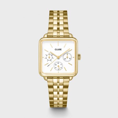 Ajoutez une touche d'élégance et de sophistication à votre garde-robe avec la montre La Tétragone Multifunction pour femmes. Elle possède un boîtier carré doré de 30 mm, un bracelet à 5 maillons, et un cadran blanc ainsi que trois sous-cadrans affichant le jour. Personnalisez facilement le look de votre montre avec n'importe quel bracelet de 16 mm. Vous pouvez ajuster vous-même la taille du bracelet.