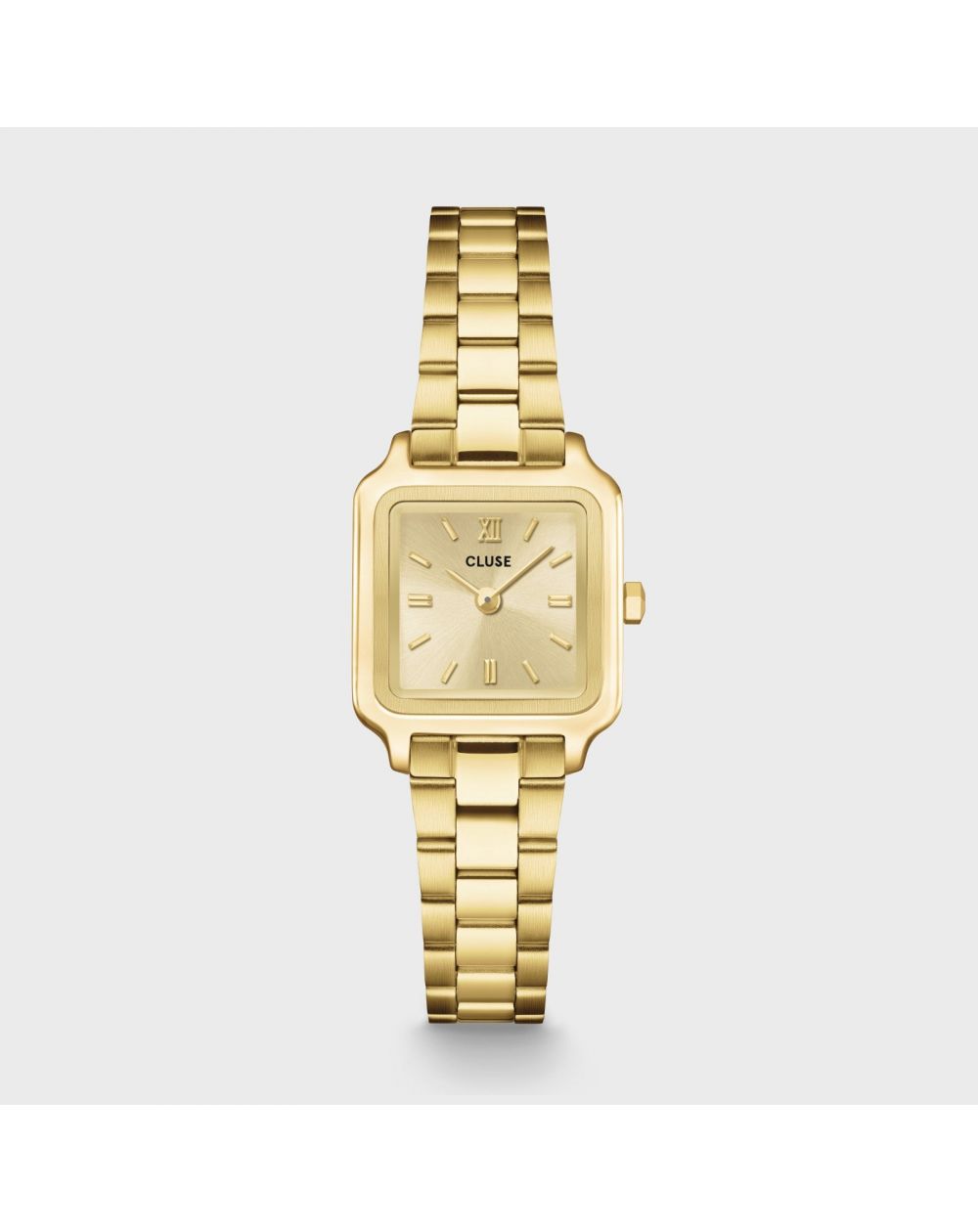 La montre carrée CLUSE Gracieuse Mini pour femme présente un boîtier doré de 21 mm, un cadran doré et un bracelet en acier inoxydable doré de 12 mm.