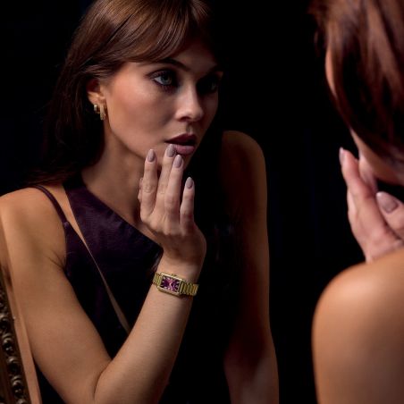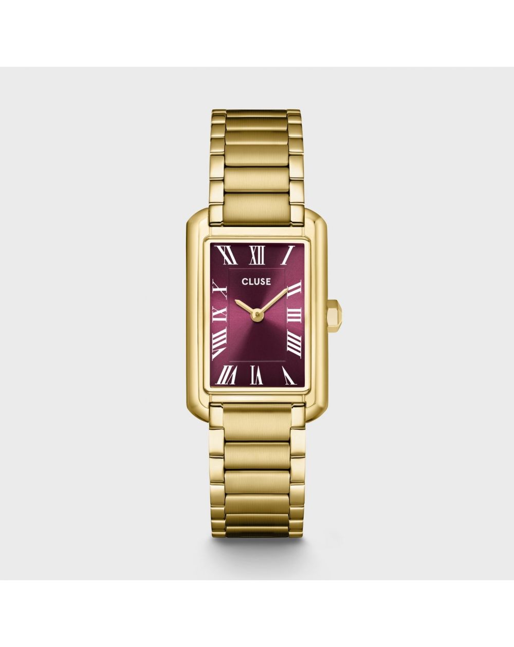 La montre Cluse rectangulaire Belisenna pour femme présente un boîtier doré de 21 mm, un cadran rouge bordeaux et un bracelet en acier inoxydable doré de 14 mm.