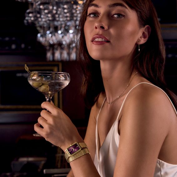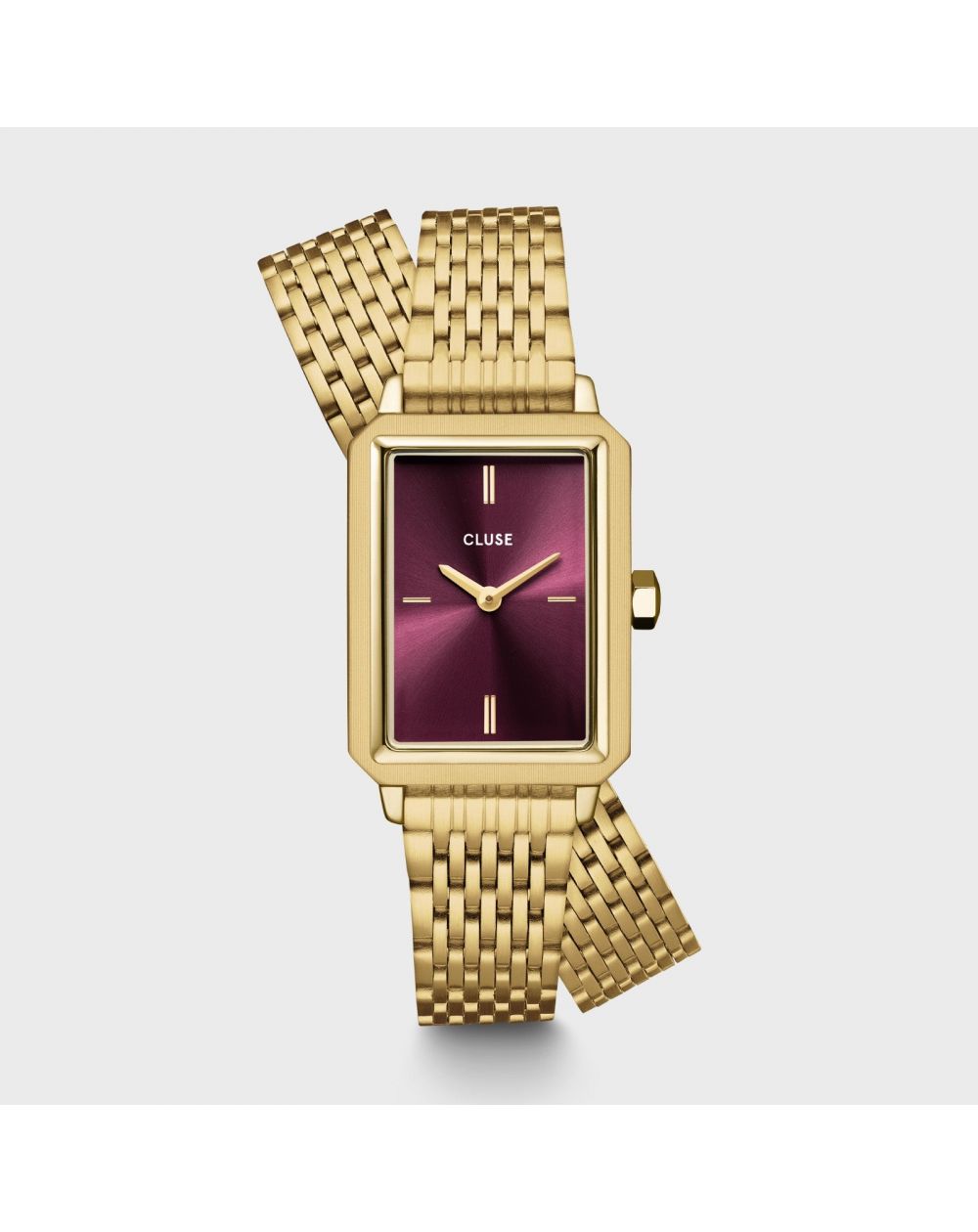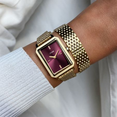 La montre rectangulaire Fluette pour femme présente un boîtier doré de 30,6 mm, un cadran rouge bordeaux et un bracelet double en acier inoxydable doré de 14 mm.