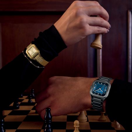 La montre carrée Quadrus pour homme présente un boîtier argenté de 35 mm, un cadran bleu et un bracelet en acier inoxydable argenté de 20 mm.