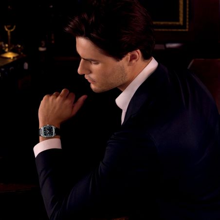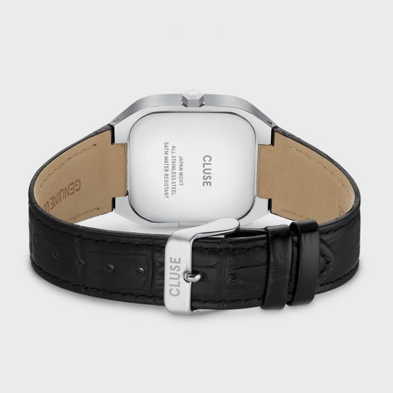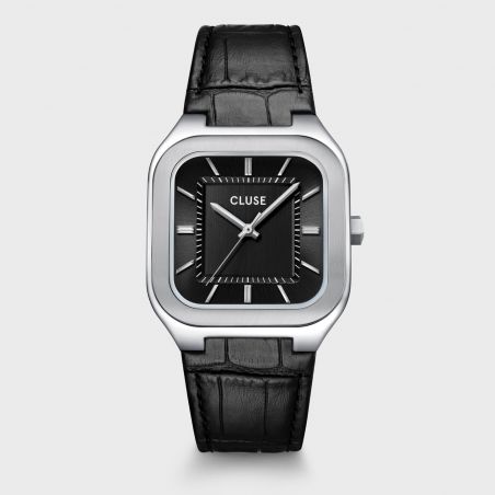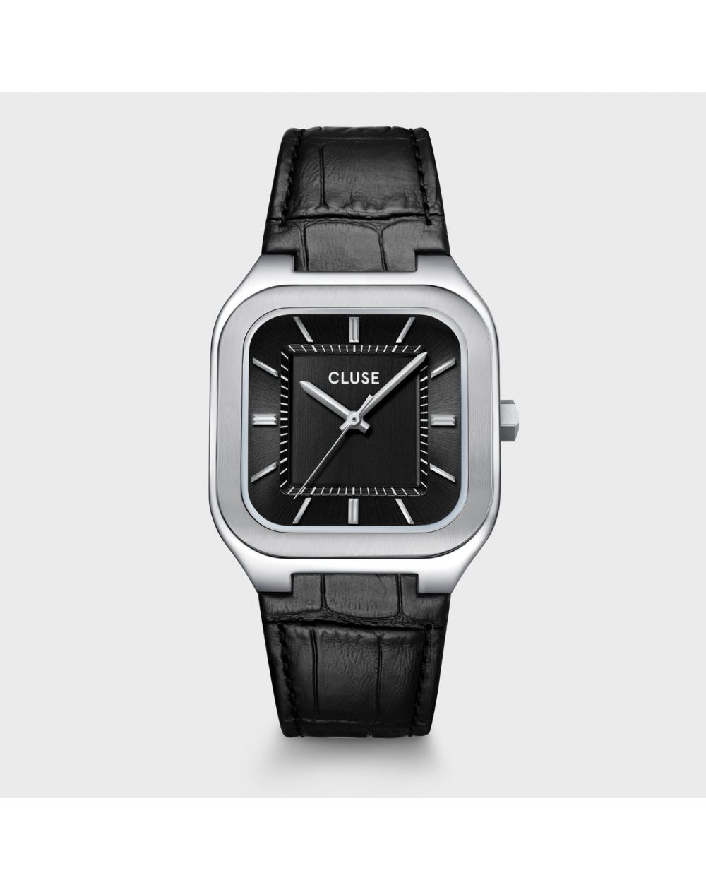 La montre carrée Quadrus pour homme présente un boîtier argenté de 35 mm, un cadran noir et un bracelet en cuir noir à texture crocodile de 20 mm.