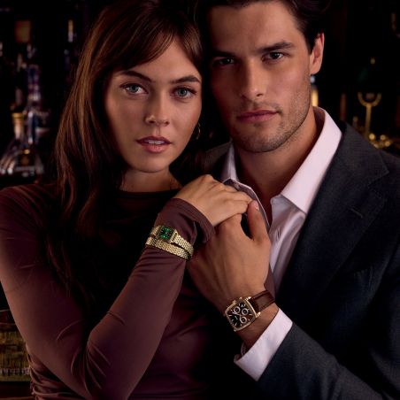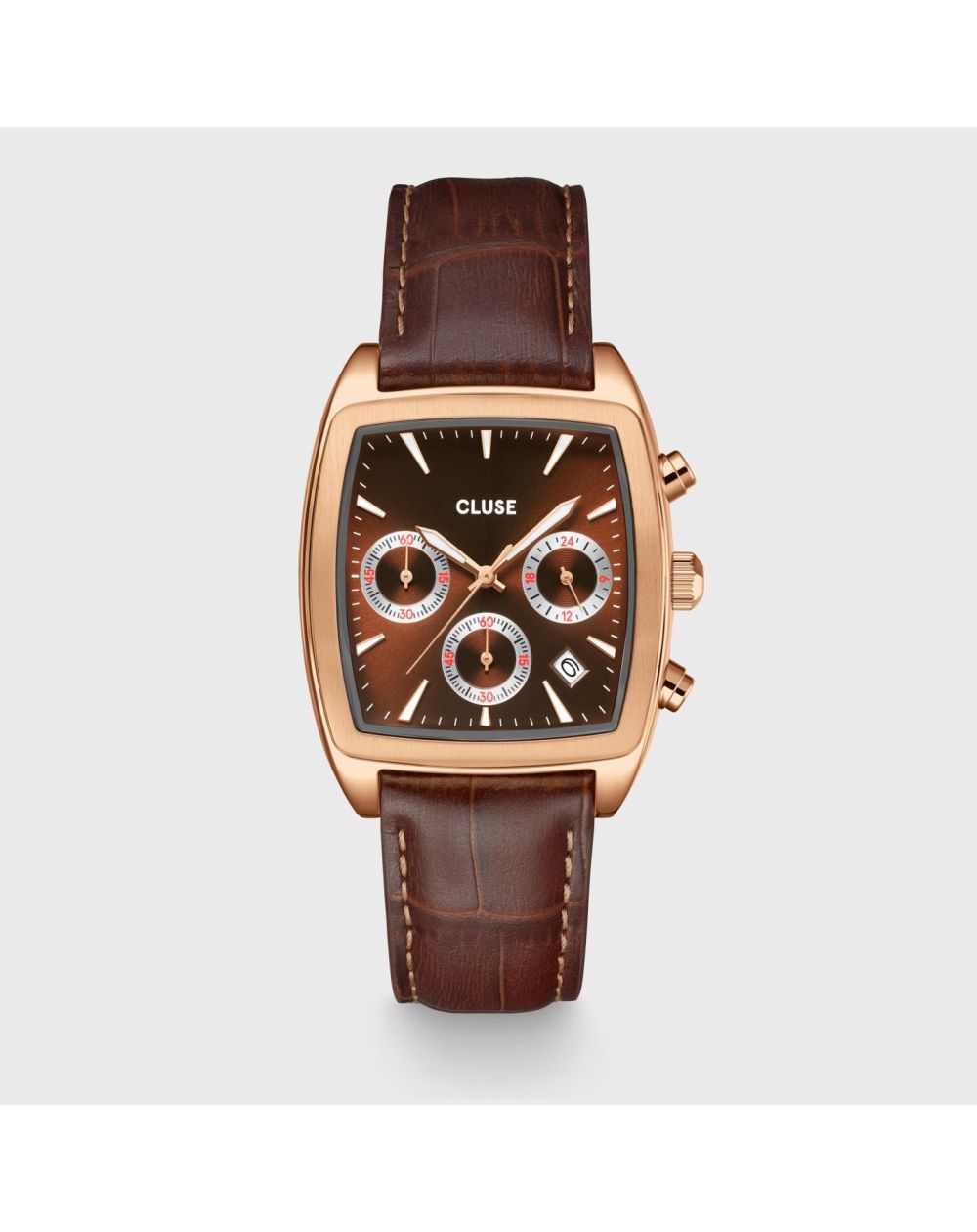 La montre tonneau Quartaut Chrono pour homme présente un boîtier de 35 mm couleur or rose, un cadran brun avec 3 sous-cadrans et un bracelet en cuir brun à texture crocodile de 20 mm.