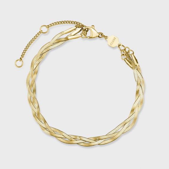 Ce coffret CLUSE contient une montre carrée dorée avec un cadran bordeaux et un bracelet en acier doré, accompagnée d’un bracelet tressé doré assorti. Le tout est présenté dans un écrin noir élégant, parfait pour offrir.