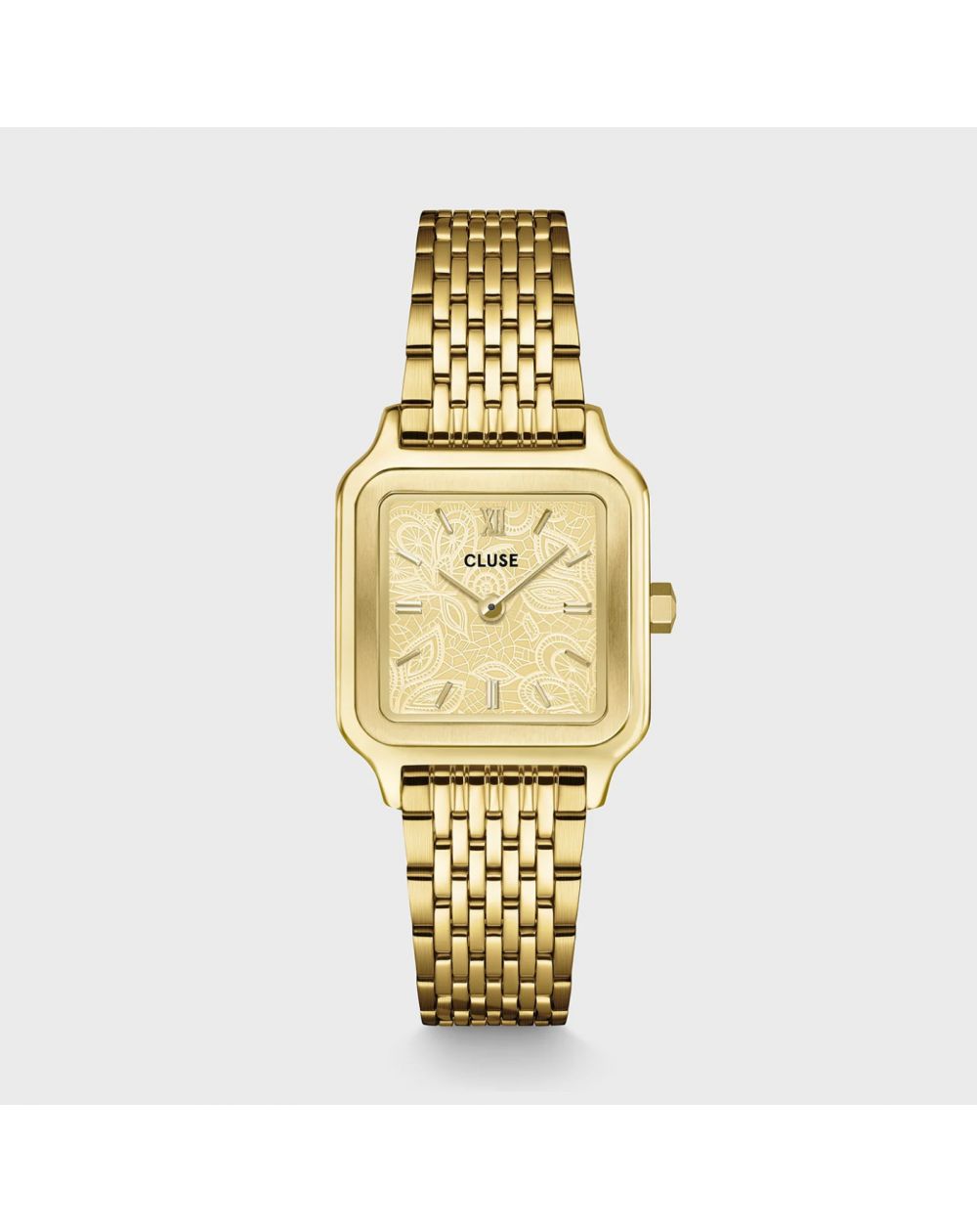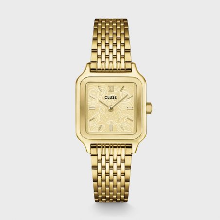 Délicate et sophistiquée, la montre Gracieuse Petite incarne une élégance subtile aux accents joailliers. Son boîtier carré de 24 mm en acier inoxydable doré s’harmonise parfaitement avec un cadran doré à texture dentelle, apportant relief et raffinement à ce modèle emblématique.
