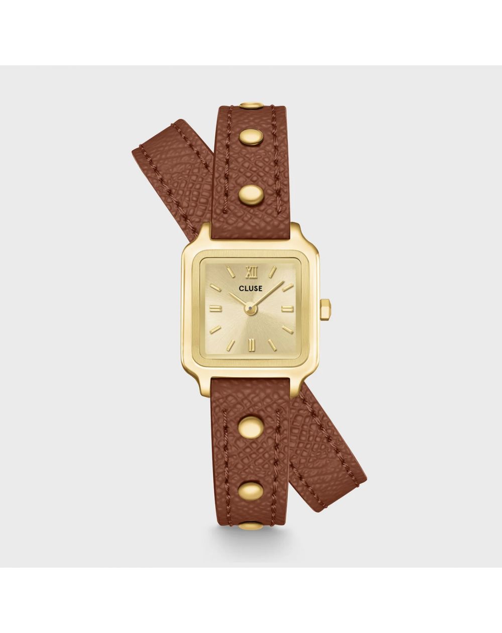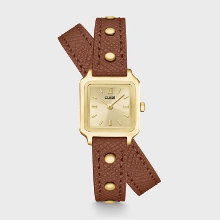 Elle est sublimée par un bracelet double tour en cuir grainé marron “nutshell”, d’une largeur de 12 mm, agrémenté de studs dorés pour une touche moderne et élégante. Confortable et facile à porter, ce bracelet est ajustable soi-même et interchangeable avec tous les bracelets 12 mm de CLUSE, permettant de personnaliser la montre selon vos envies.
