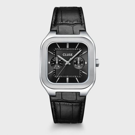 Élégante et affirmée, la montre Quadrus Multifunction incarne un style masculin moderne aux lignes structurées. Son boîtier carré de 41 × 35 mm en acier inoxydable argenté encadre un cadran noir profond, rehaussé de détails argentés pour une lisibilité optimale et un rendu sobrement sophistiqué.