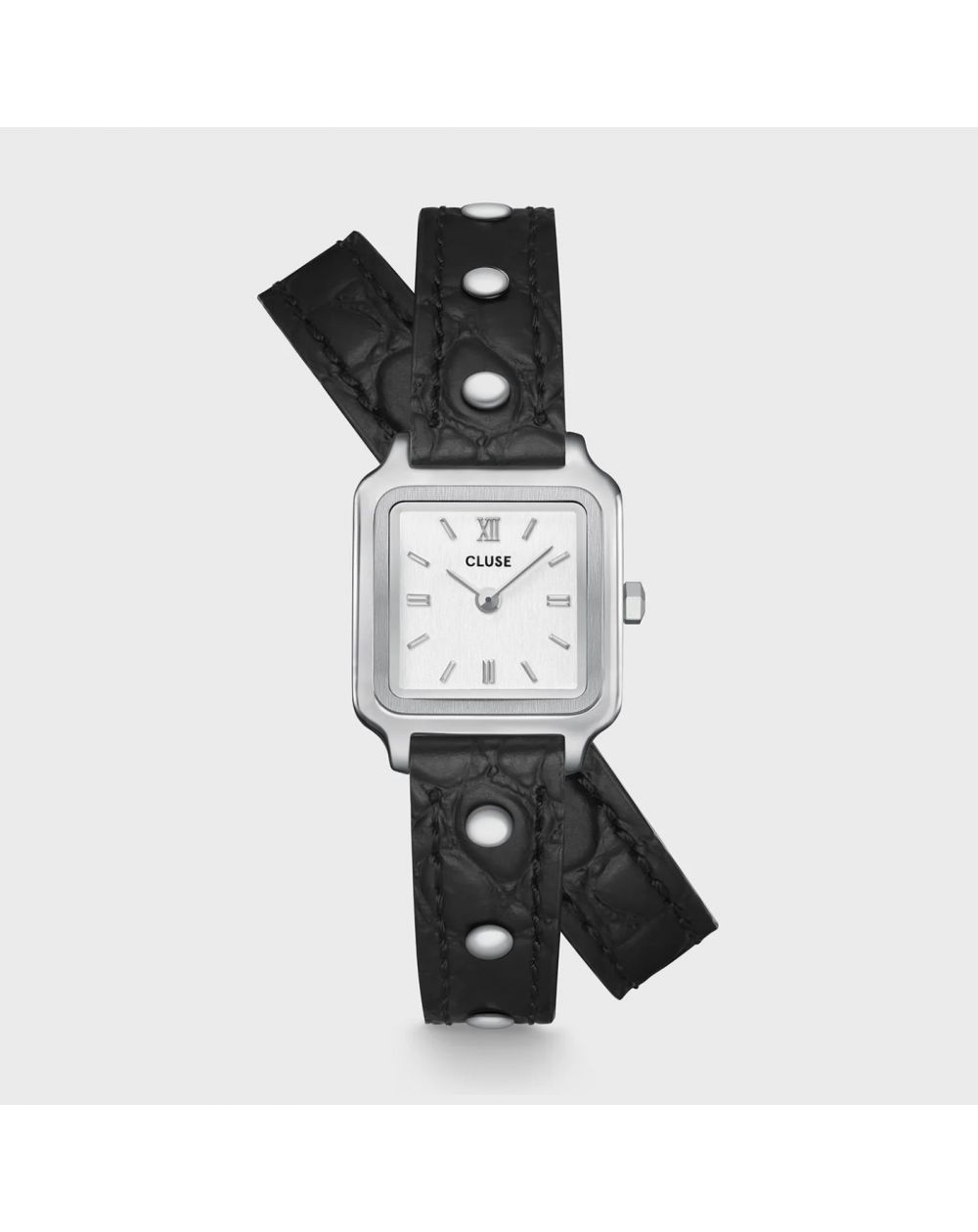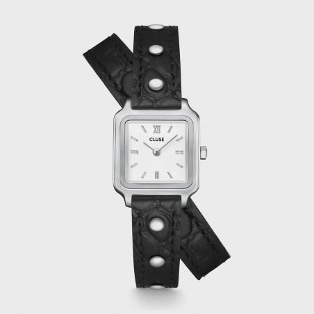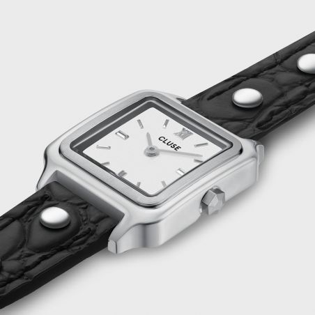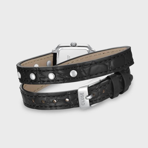 Elle est sublimée par un bracelet double tour en cuir noir de 12 mm, agrémenté de studs argentés, qui apporte une touche moderne et affirmée. Confortable et facile à ajuster soi-même, ce bracelet est également interchangeable avec tous les bracelets 12 mm de CLUSE, permettant de personnaliser la montre selon vos envies.