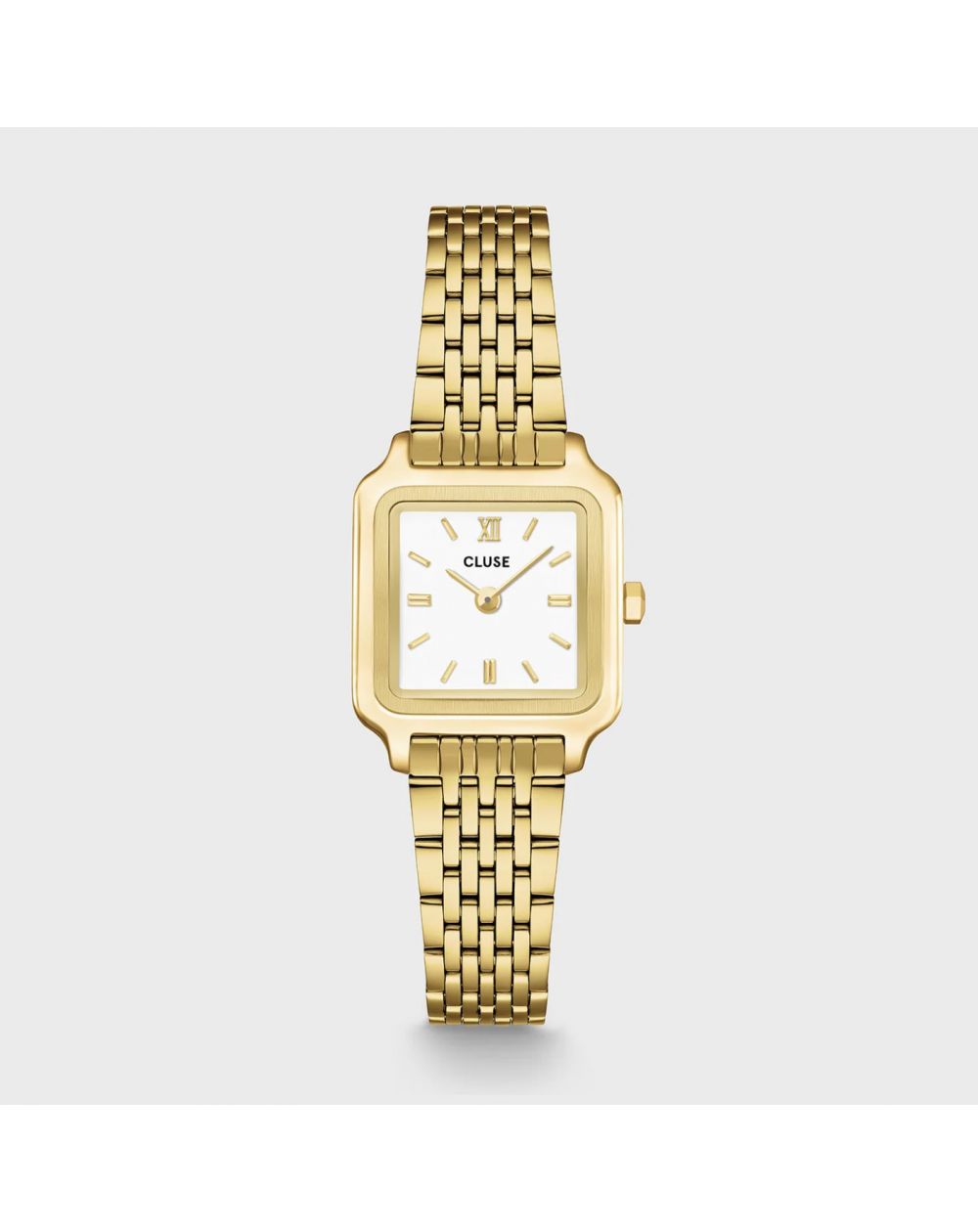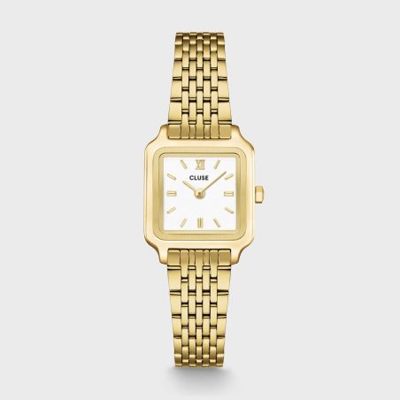 Épurée et délicatement féminine, la montre Gracieuse Mini séduit par son design bijou et ses lignes raffinées. Son boîtier carré de 21 mm en acier inoxydable doré encadre un cadran blanc lumineux, offrant une lecture claire et élégante de l’heure.