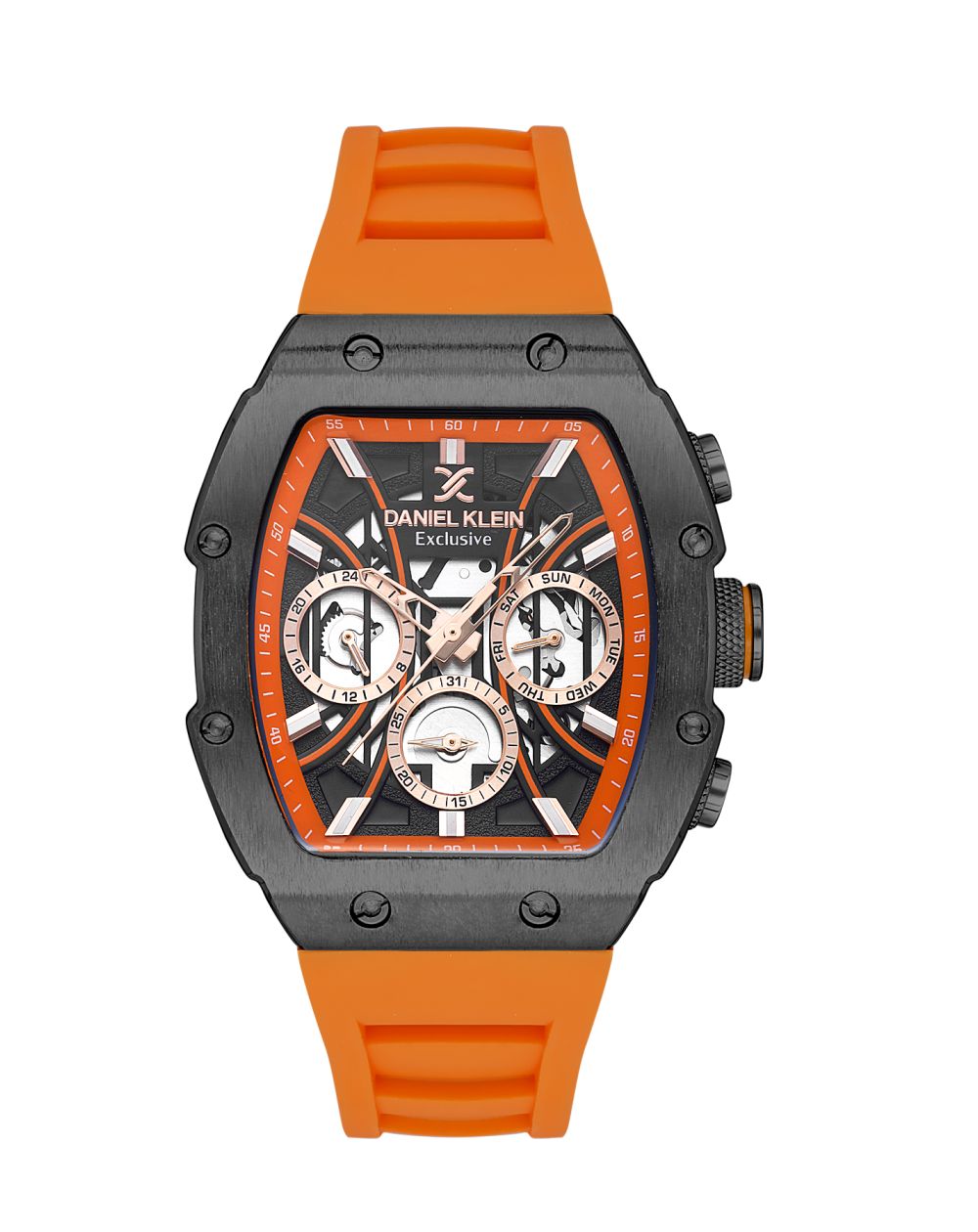 Découvrez l'audace et l'élégance de cette montre Daniel Klein Exclusive. Avec son boîtier noir robuste et son bracelet en silicone orange vif, cette montre ne passe pas inaperçue. Le cadran complexe affiche plusieurs fonctions, y compris un chronographe, un indicateur de date et un affichage des jours de la semaine, le tout accentué par des détails argentés et oranges.