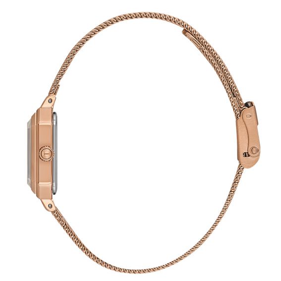 Le cadran argenté épuré est mis en valeur par des index et aiguilles rose gold assortis, créant un jeu de lumière élégant qui attire le regard à chaque mouvement. Son bracelet mesh rosé gold, fin et confortable, assure un maintien parfait tout en ajoutant une note chic et contemporaine.