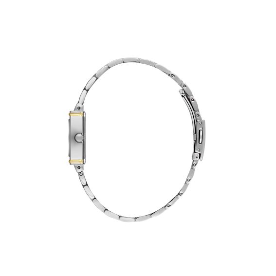 Élégante et délicate, cette montre femme bicolore argent et or séduit par son design fin et intemporel. Avec son boîtier de 22 mm, elle est parfaite pour les poignets fins, offrant un rendu discret et raffiné.