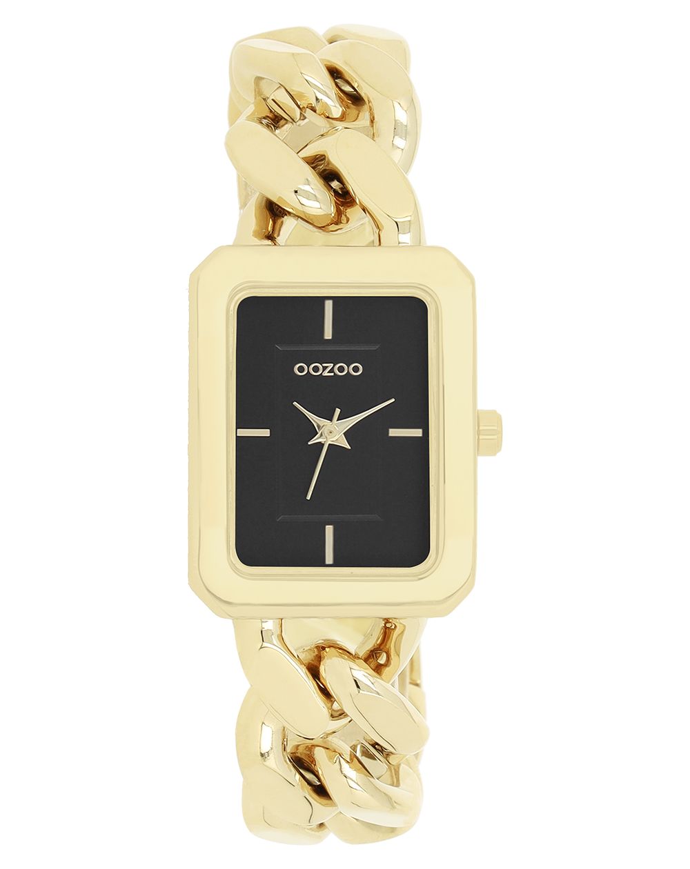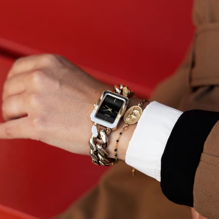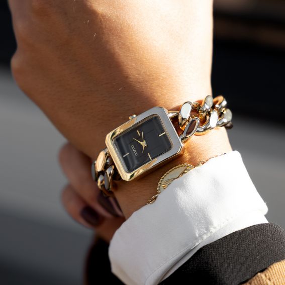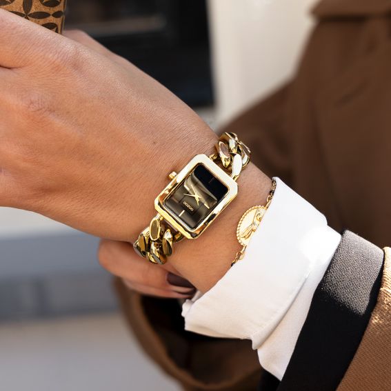 Cette montre de la marque Oozoo est une montre pour femme avec un bracelet fait de grandes mailles.
