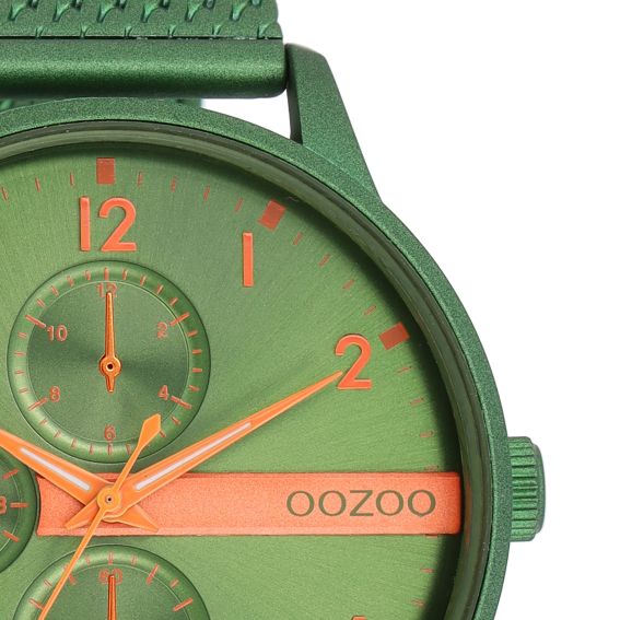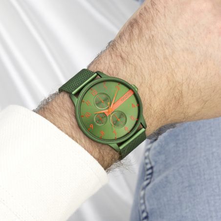 Démarquez-vous avec ce magnifique design rond pour hommes de la collection tendance OOZOO Timepieces. Le C11303 est doté d'un bracelet en maille métallique vert mat et d'un boîtier de montre vert mat de 45 mm. Vous faites une véritable déclaration de mode avec ce cadran à barres vertes, chiffres orange fluo et aiguilles argentées/blanches. Cette montre indispensable à votre garde-robe est dotée d'un verre minéral et d'un boîtier en métal avec placage. Cette conception a une plaque arrière en acier inoxydable et est sans danger pour le nickel. Cette montre possède un mouvement japonais 2ATM et est couverte par une garantie de 2 ans