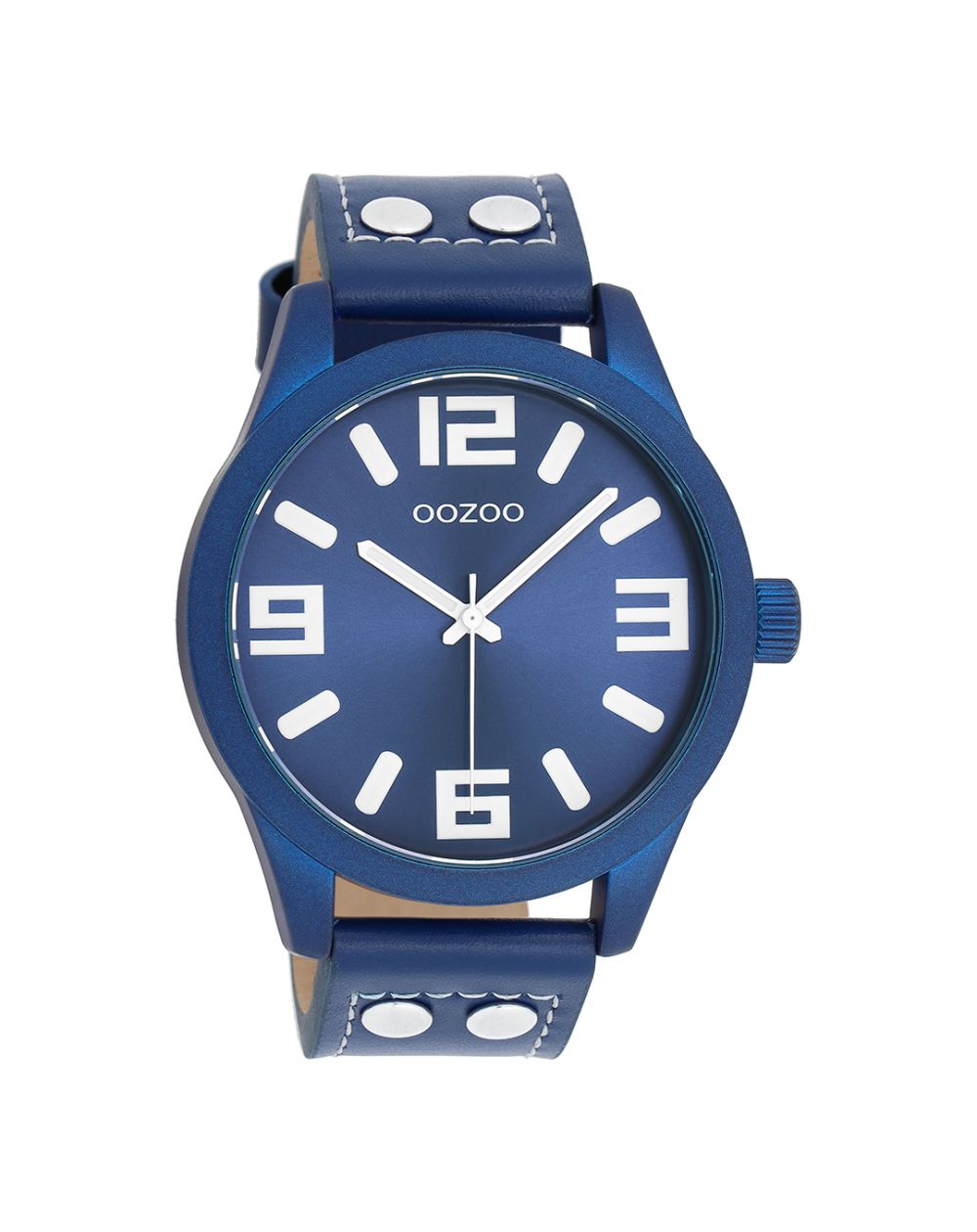 La montre Oozoo C1092 possède un boîtier de 46 mm de diamètre avec une finition matte bleu. Elle arbore un cadran aux grands chiffres blancs pour une lisibilité optimale. Avec son bracelet en cuir assorti et ses rivets décoratifs, elle est résistante à l'eau jusqu'à 2 ATM.
