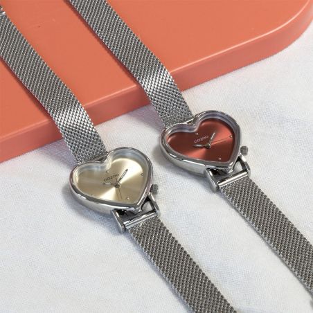 Illuminez votre style avec cette montre en forme de cœur, une création unique de la collection OOZOO Timepieces. Le modèle C11443 combine un bracelet en maille métallique argentée avec un boîtier assorti de 28x29 mm, offrant une allure élégante et contemporaine. Le cadran jaune doré à effet soleil, agrémenté d'index en points argentés et d'aiguilles assorties, ajoute une touche éclatante et sophistiquée à ce bijou horloger.