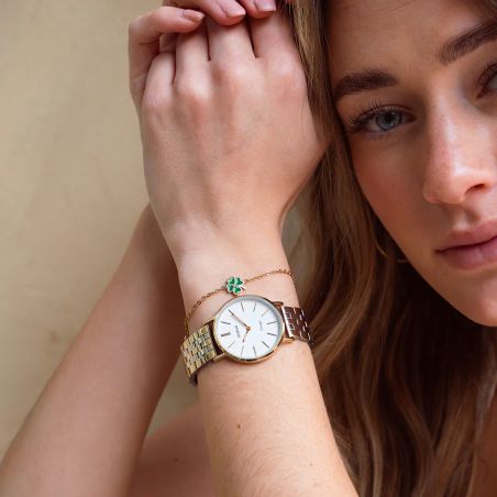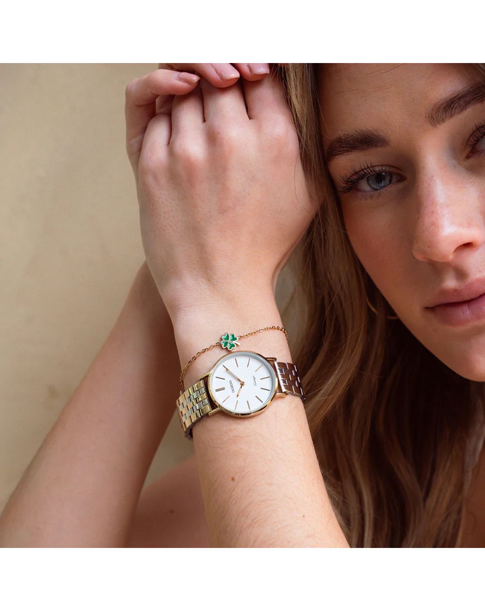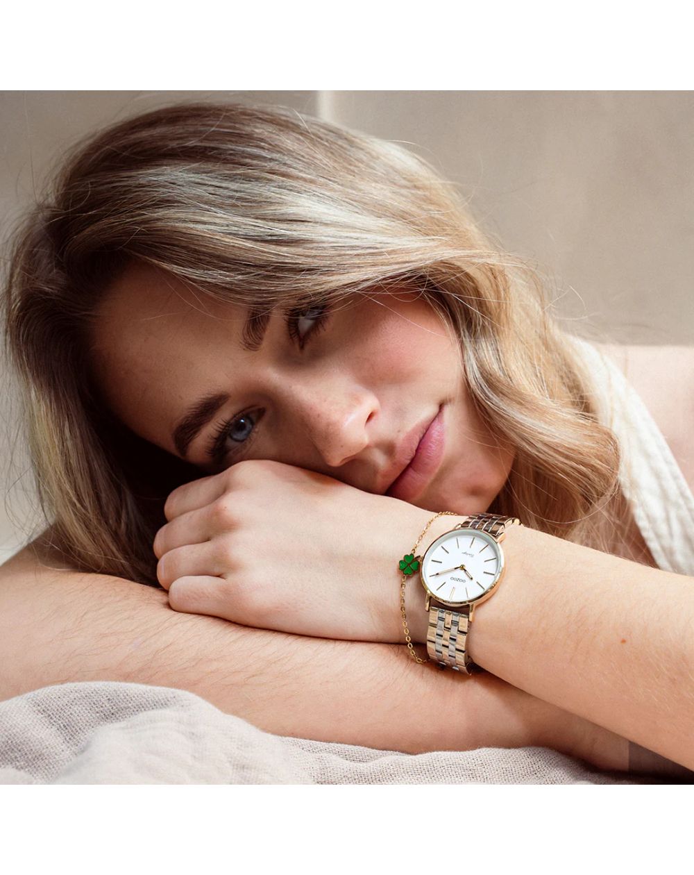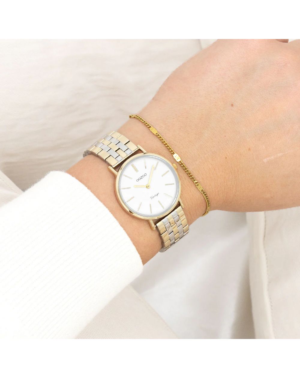 Élégante et intemporelle, cette montre OOZOO arbore un cadran blanc épuré avec des détails dorés raffinés. Son bracelet en acier inoxydable doré et argenté offre un style chic et moderne, parfait pour toutes les occasions.