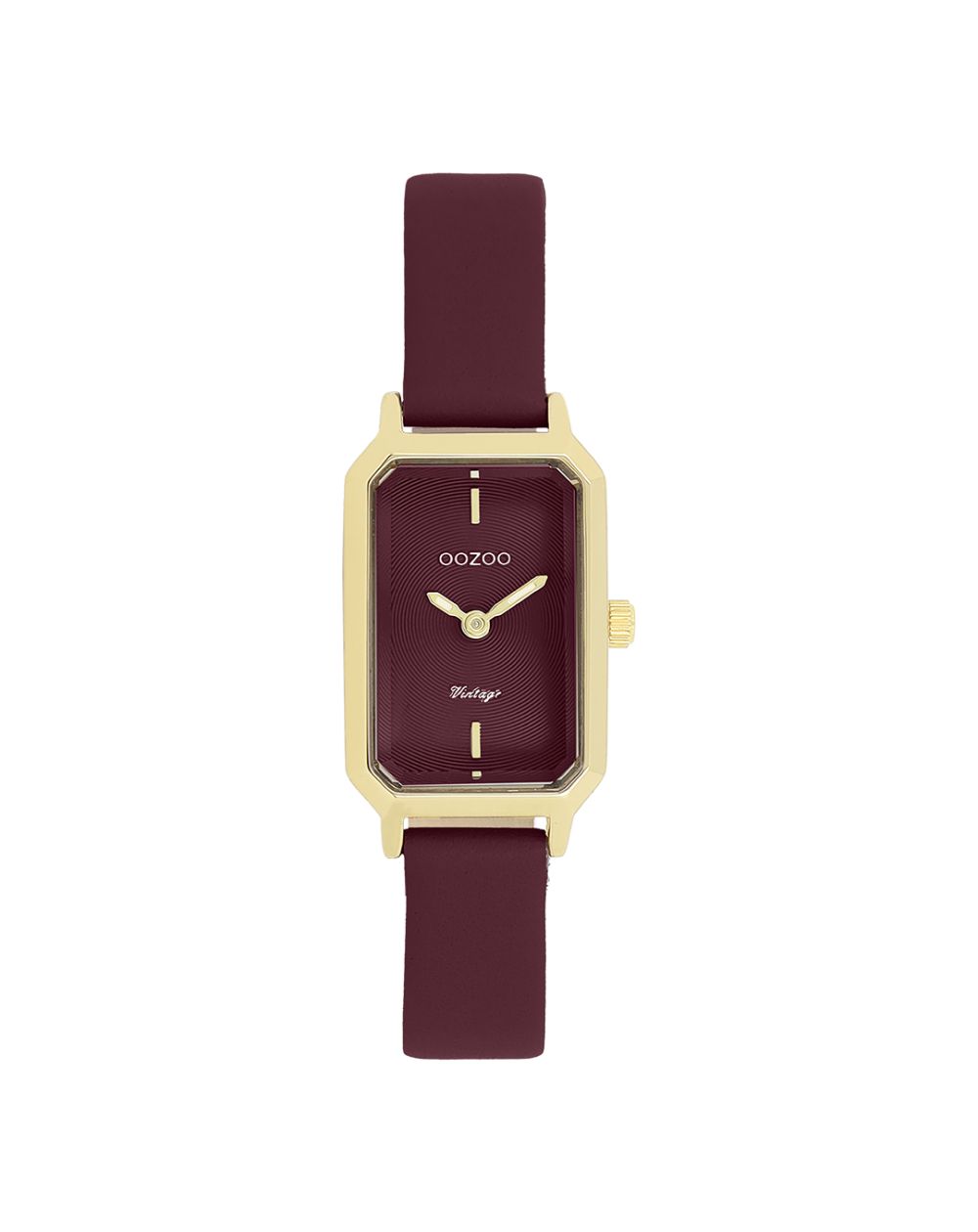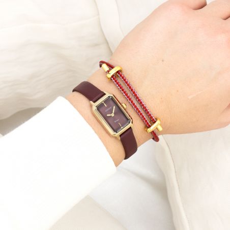 Intense et raffinée, cette montre pour femme se distingue par son bracelet en cuir bordeaux profond, associé à un boîtier rectangulaire doré aux lignes élégantes.