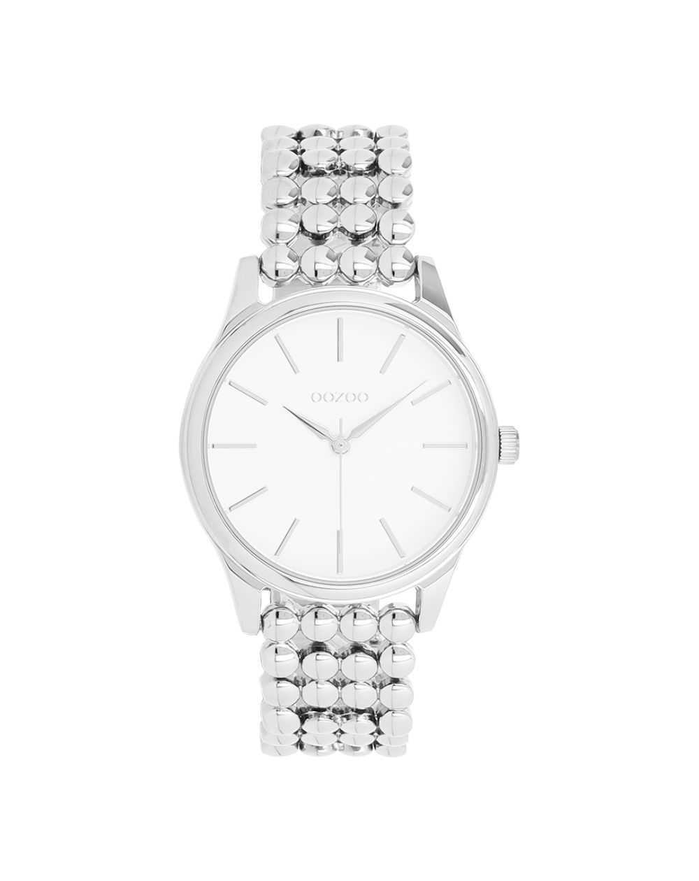 Élégante et lumineuse, cette montre femme séduit par son bracelet en acier inoxydable composé de maillons perlés arrondis, offrant un véritable effet bijou au poignet.