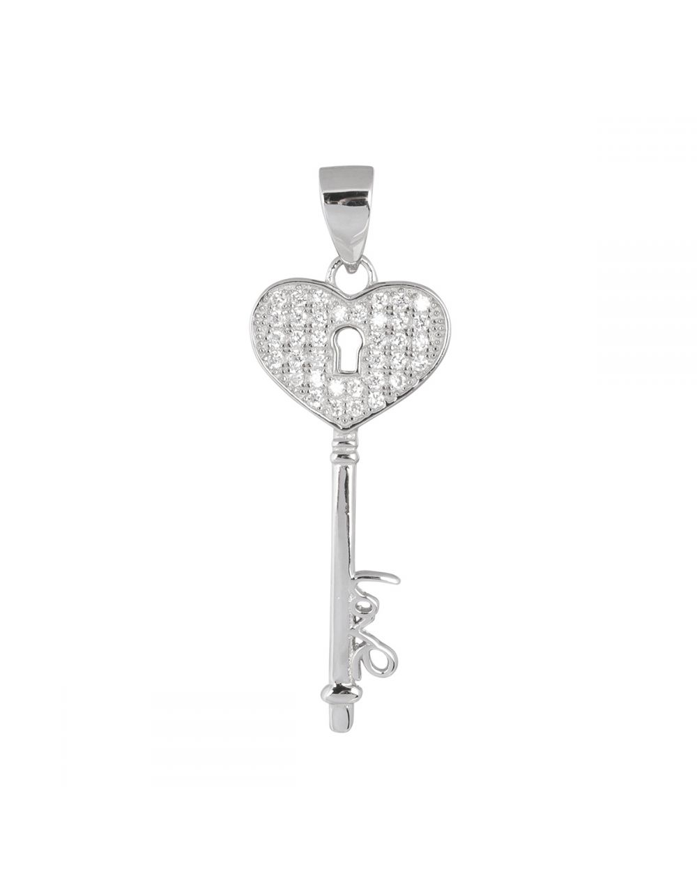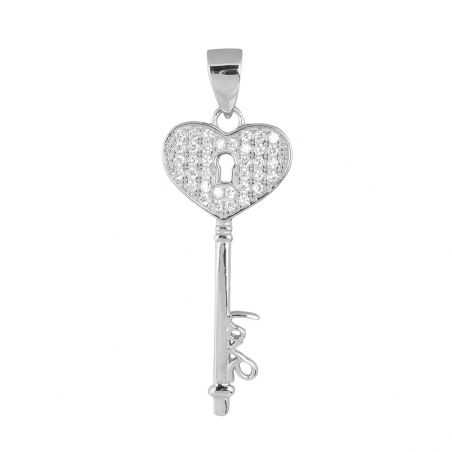 Ce pendentif est un grand pendentif en argent 925 en forme de clé et de coeur. L'inscription Love est finement dessiné sur le bout de la clé. Le coeur est serti de pierres en oxyde de zirconium.