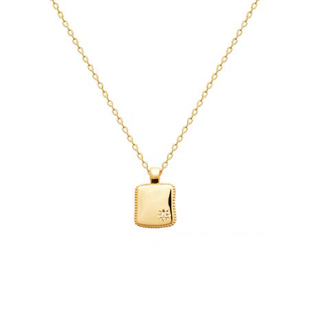 Cette médaille carrée aux angles doux, bordée de perles délicates, évoque les talismans antiques protecteurs. En son centre, une étoile gravée sertie d’un zirconium lumineux rappelle la constellation, signe d’espoir et de clarté.