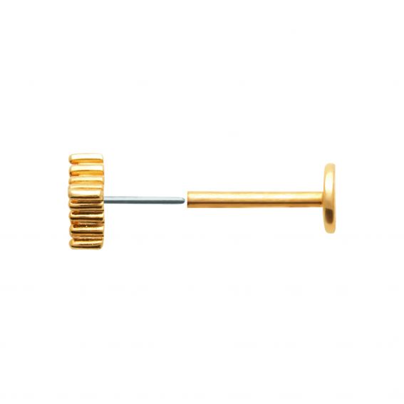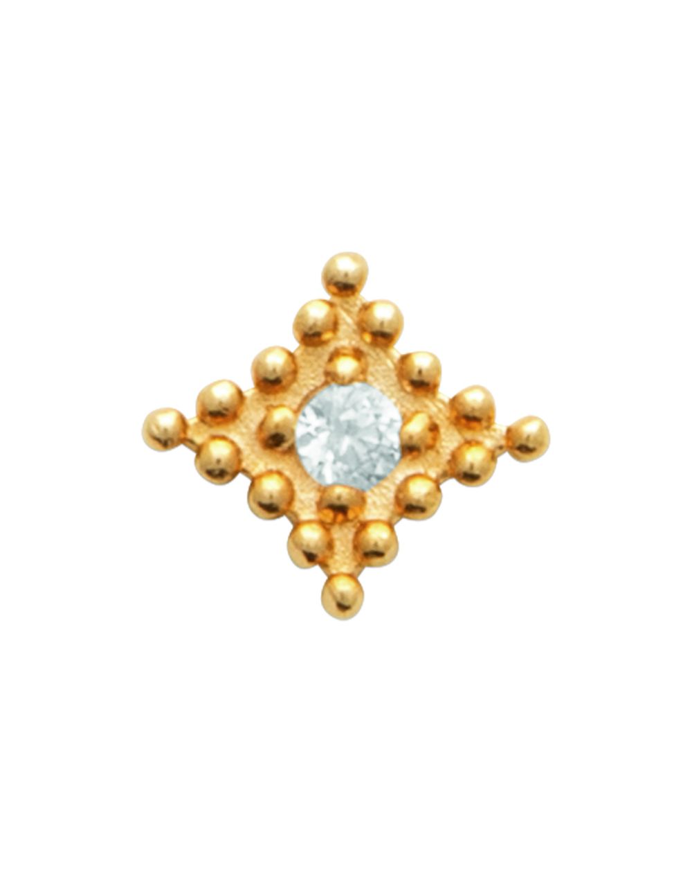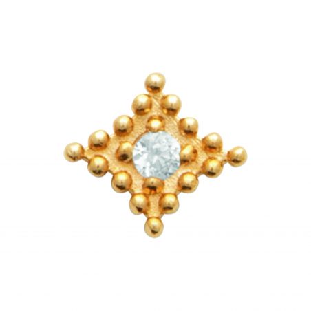 Inspiré des talismans anciens, ce piercing capte la lumière avec intensité grâce à son cristal central enchâssé dans un motif en losange perlé. L’éclat du plaqué or 18 carats associé à une structure symétrique délicatement texturée en fait un bijou à la fois solaire, protecteur et élégant. Monté sur une tige en titane hypoallergénique, il est aussi agréable à porter qu’à admirer.