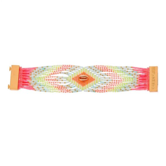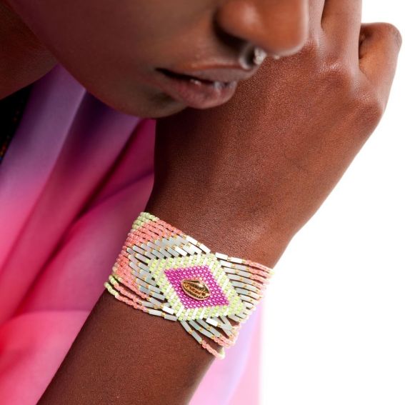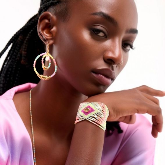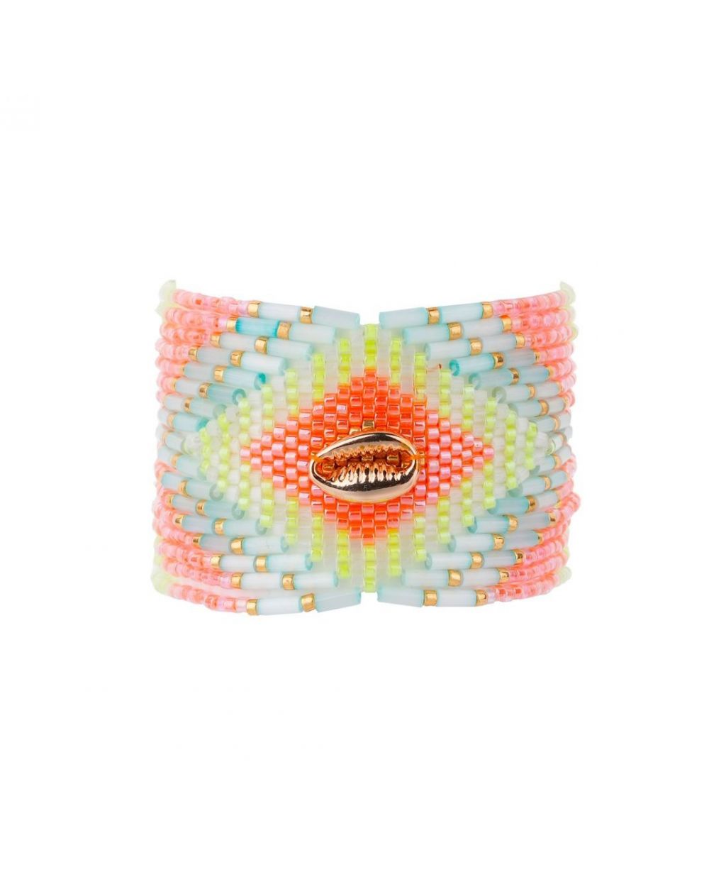 Élément incontournable et intemporel, notre manchette emblématique continue de se réinventer ! Elle arbore ici les teintes douces et lumineuses des cieux estivaux, juste avant que le soleil ne touche l'horizon. Nous adorons son format XL et le tissage délicat des perles de rocaille qui habillent somptueusement le poignet. Au centre, notre cauri doré à l'or fin, intemporel et iconique, ajoute une touche de glamour et de chic à cette manchette.