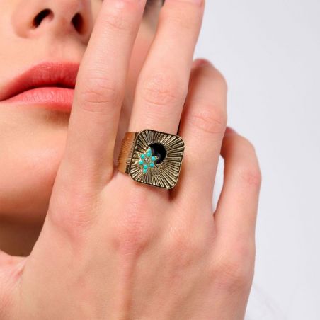 Pour les femmes audacieuses, mystérieuses et dotées d'un caractère affirmé, ce thème est spécialement conçu pour vous ! Évadez-vous du quotidien et incarnez l'élégance d'une héroïne intemporelle dans une histoire fascinante. Cette bague, d'une sophistication envoûtante, promet de sublimer votre style avec une allure inégalée. Son corps de bague ajustable assure un confort parfait, tandis que son design audacieux se déploie en stries éclatantes inspirées de l'Art Déco. Le cabochon central, aux contours subtilement arrondis, est serti d'une étoile ornée de pierres turquoise et cristallines, tandis qu'une sphère noire émaillée, évoquant une nuit mystérieuse et magique, ajoute une touche de mystère irrésistible à cette pièce unique.