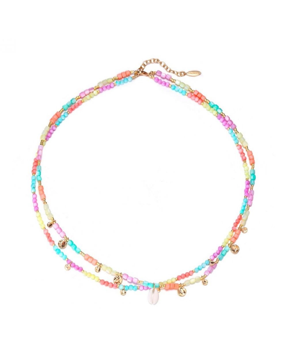 Si l'été était un bijou, ce serait ce collier double rang et ras du cou aux couleurs acidulées. Il incarne avec légèreté la douceur des vacances, le clapotis des vagues, les bords de mer, les embruns, le sable glissant entre les doigts et les cieux d'été flamboyants. De jolis grelots dorés à l'or fin ornent les deux rangs du collier, et le cauri, pièce emblématique de notre thème, vient parfaire sa structure. Un must-have estival et intemporel, aux douces notes enfantines, que vous n'aurez plus envie de quitter !