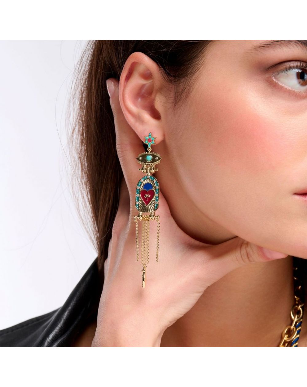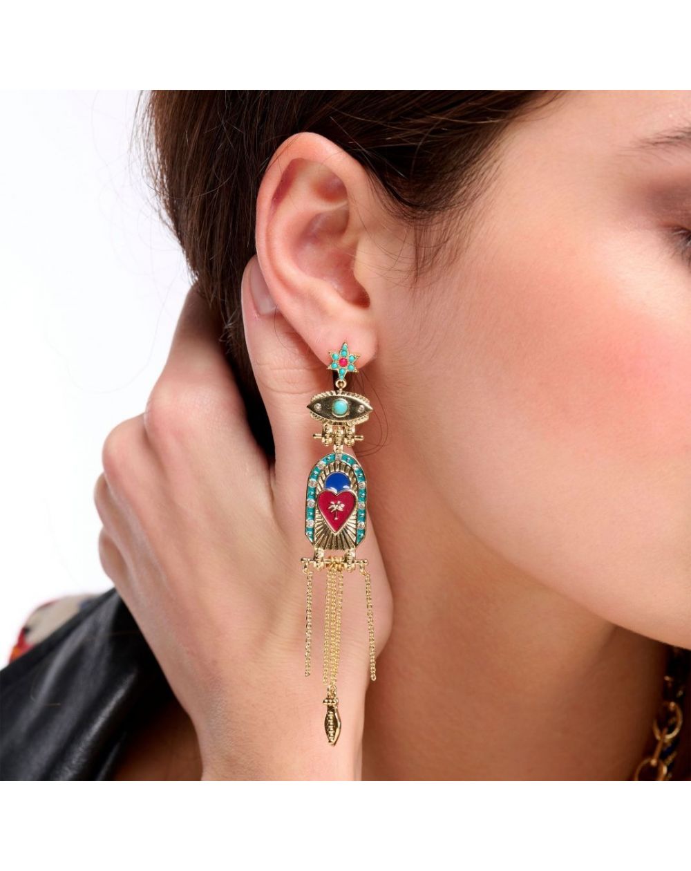 Femmes de caractère, audacieuses et mystérieuses : ce thème est conçu pour vous ! Osez laisser la routine derrière vous et plongez dans l'univers fascinant d'une héroïne chic et captivante. Entre superstition bienveillante et intrigues envoûtantes, réveillez l'ensorceleuse en vous avec cette somptueuse paire de boucles d'oreilles dorée à l'or fin. Longilignes et parfaitement proportionnées, ces boucles d'oreilles sont ornées d'une petite étoile scintillante de strass qui illumine délicatement le haut de la pièce. En dessous, un œil protecteur raffiné et éclatant sert de pivot à la pièce centrale, véritable chef-d'œuvre où une ligne d'émail, sertie de pavés de strass, encadre un cœur en émail fuchsia foncé. Sur ce cœur, trône un palmier incrusté, entouré de rayons enchanteurs et évocateurs. Les chaînes en cascade, au bout desquelles se balance une feuille dorée à l'or fin, viennent parfaire cette création unique, déjà convoitée pour son élégance audacieuse et son allure mystérieuse.