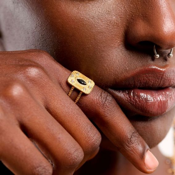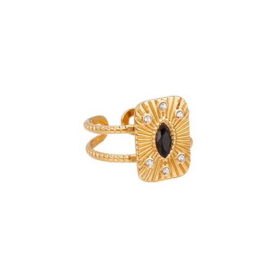Divine Deevina ! Cette bague somptueuse, au style irrésistiblement chic, repose sur un délicat tissage de perles tubulaires Miyuki d'un noir intense et de perles dorées à l'or fin 14 carats. En son centre, un trèfle réinventé et pavé de strass, évoque un trésor enfoui, ajoutant une subtile touche de magie à cette création. Conçue pour s'adapter à toutes les tailles grâce à son ouverture à l'arrière, cette bague allie élégance et enchantement avec une aisance raffinée.
