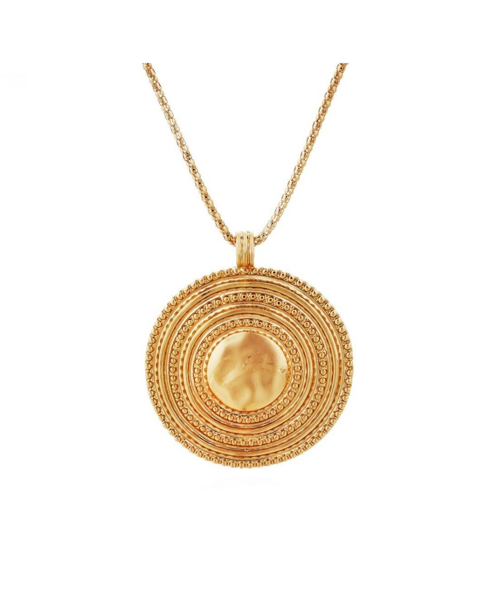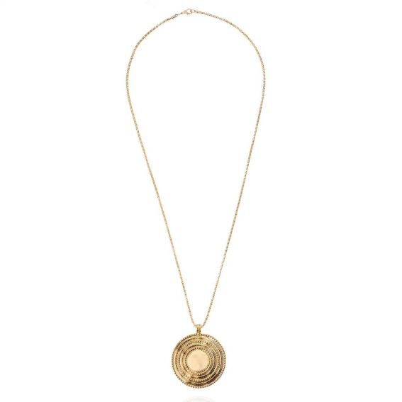 Sautoir composé d'une fine chaîne en maille corde et d'un pendentif en pastille bombée, cerclé de motifs boules en relief, Cleopine ne passe pas inaperçu ! D'inspiration subtilement Inca, cette pièce somptueuse, dorée à l'or fin 14 carats, incarne parfaitement l'essence de notre collection Prestige, avec son allure majestueuse et son élégance spectaculaire. Disponible en deux couleurs : or et argent.