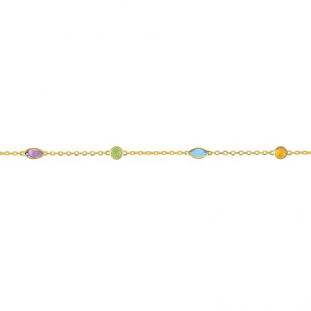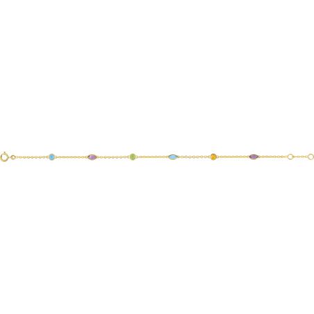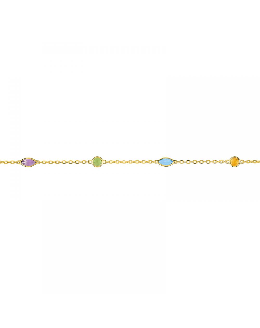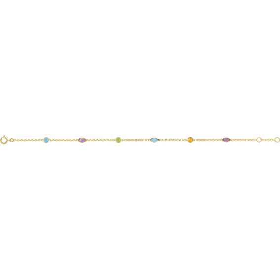 Deze gouden armband van 9 karaat is een armband gevormd door verschillende stenen (Topaz, Emerald, Amethyst, Peridot) van verschillende vormen. Deze armband is in lengte verstelbaar van 16,5 cm tot 18 cm.