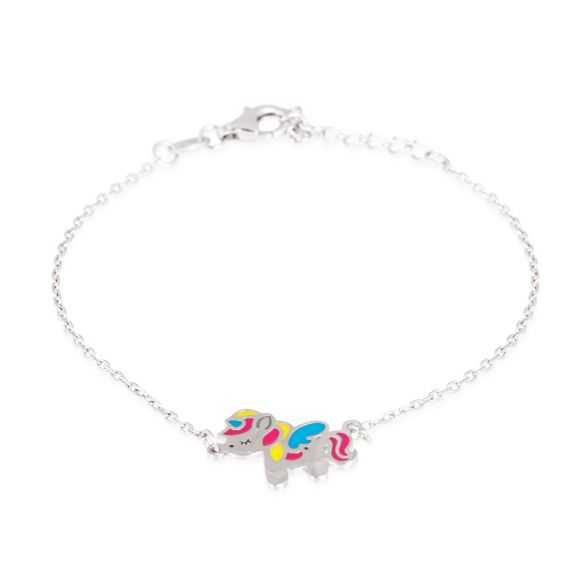 Deze kinderarmband van 925 zilver is een armband met een geëmailleerde eenhoorn van 17 mm breed en 13 mm hoog. Deze armband is in lengte verstelbaar van 19cm tot 16cm.
