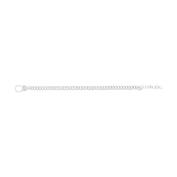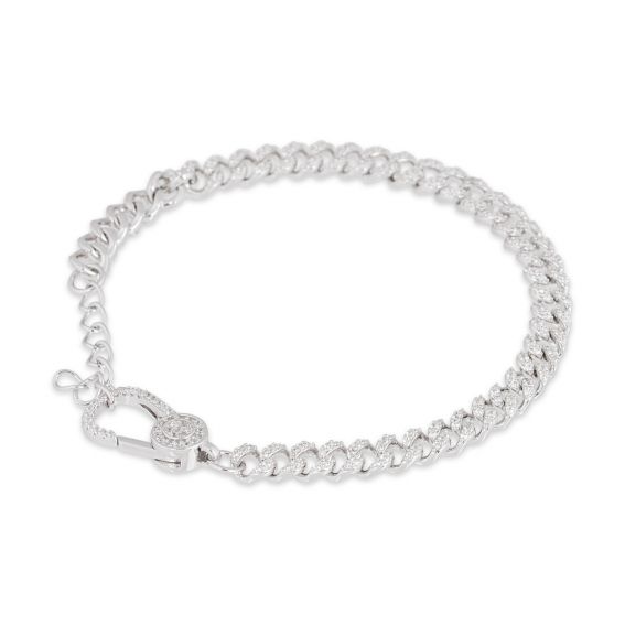 Deze armband is een zilveren armband bezet met verschillende zirkoniumoxide steentjes op de schakels. Ik zag het detail met de met juwelen bezette karabijnhaak. Deze is 6 mm breed.