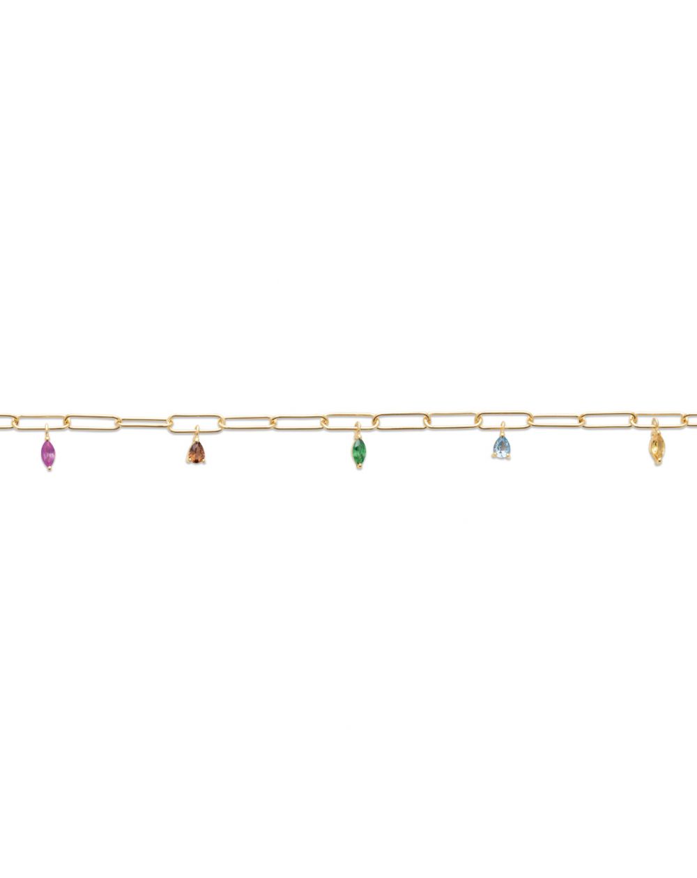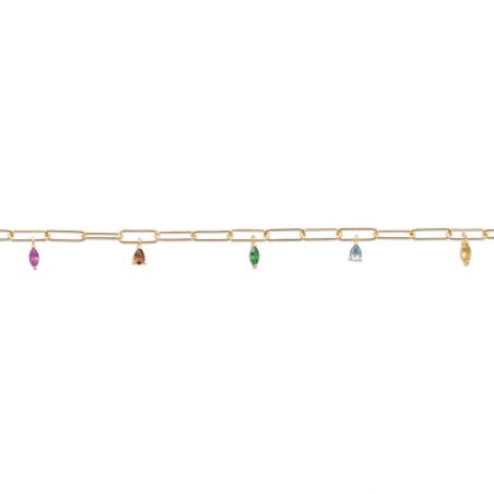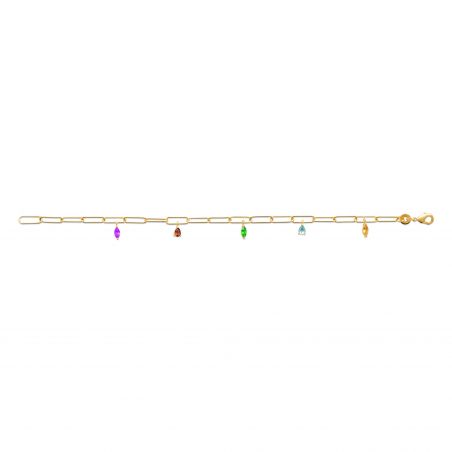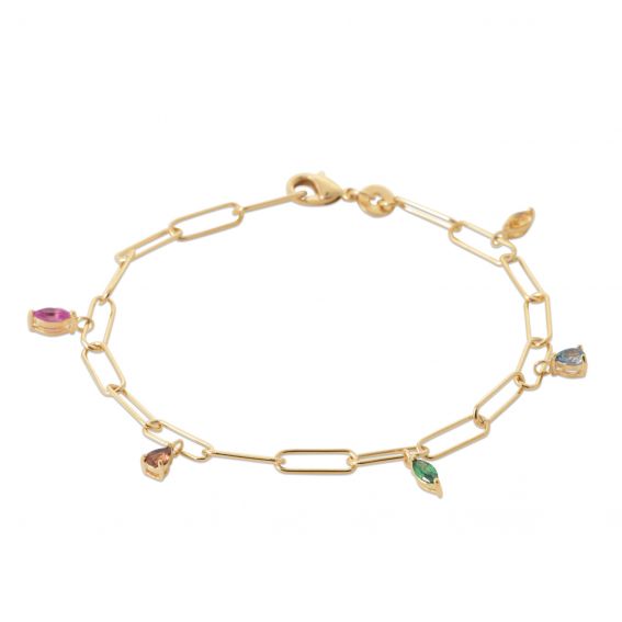 Deze damesarmband is een 18-karaats vergulde armband bezet met verschillende veelkleurige amandelvormige stenen.