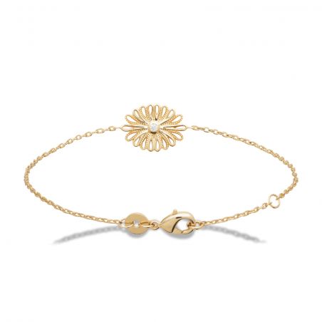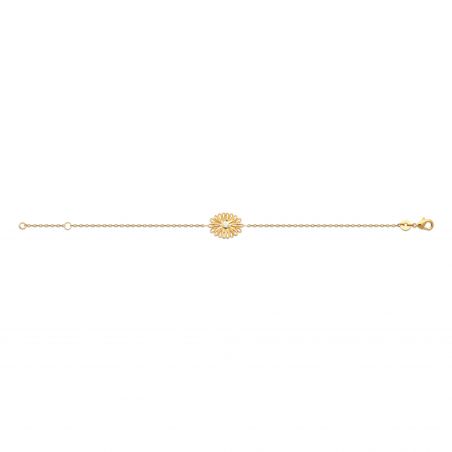 Deze vergulde armband is discreet elegant met zijn delicate ontwerp. Het heeft een fijne ketting en een centraal opengewerkt motief in de vorm van een bloem of zon, wat een vleugje subtiele elegantie toevoegt. Deze armband is perfect voor een minimalistische en verfijnde look en kan alleen of in combinatie met andere armbanden worden gedragen.