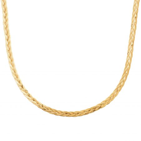 Dit sieraad is een vergulde ketting met verfijnd vlechtwerk, wat het een elegante en tijdloze uitstraling geeft. Het verweven patroon geeft het stuk textuur en diepte, waardoor een subtiel spel van licht en reflecties ontstaat. Deze ketting kan alleen gedragen worden voor een strakke stijl of gecombineerd met andere sieraden voor een meer verfijnde look.