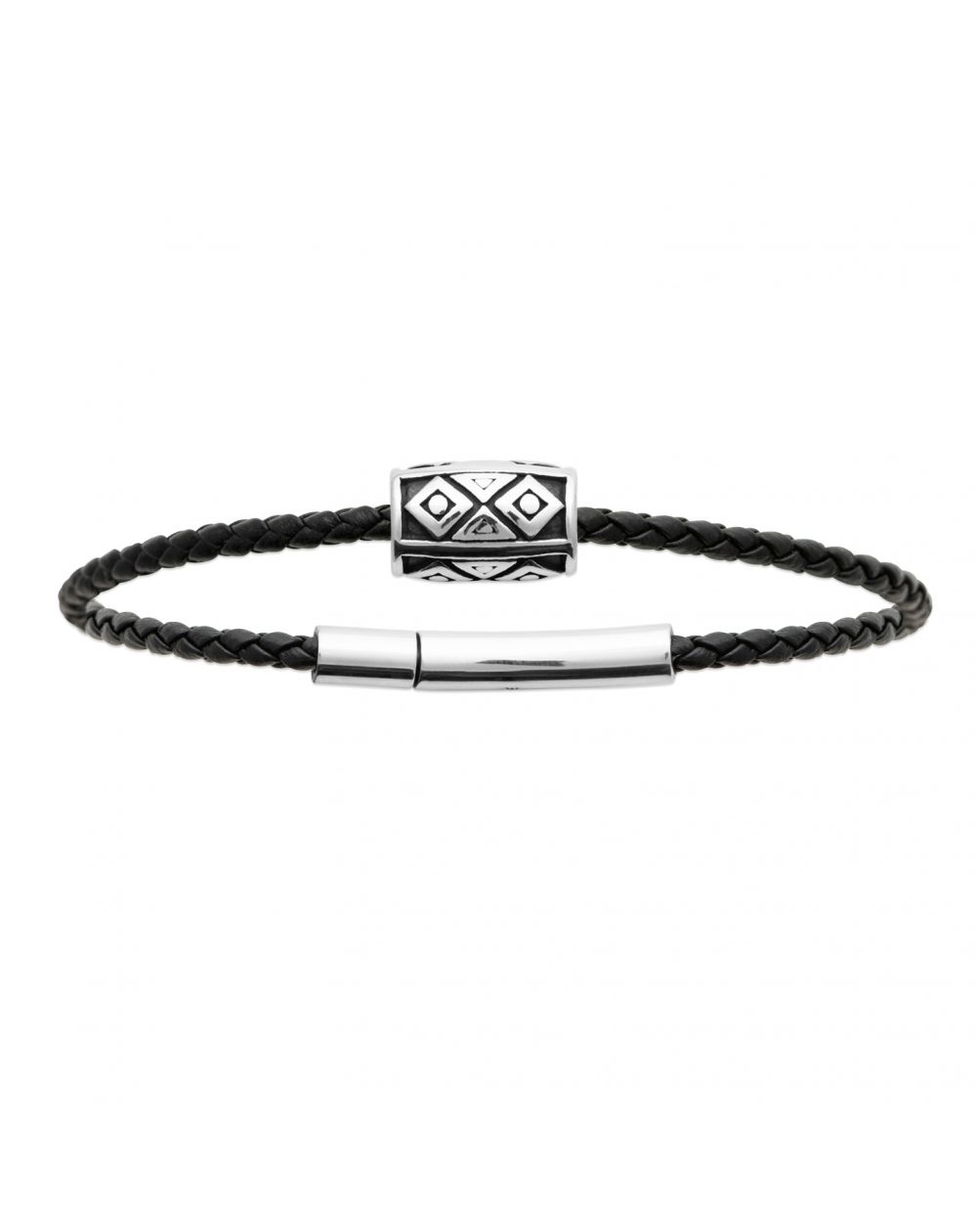 De Arizona-armband is geïnspireerd op etnische symbolen en combineert gevlochten zwart leer met een centrale roestvrijstalen kraal waarop tribale geometrische patronen zijn gegraveerd. Een discreet en tegelijk opvallend juweel dat eeuwenoude tradities combineert met eigentijdse esthetiek.