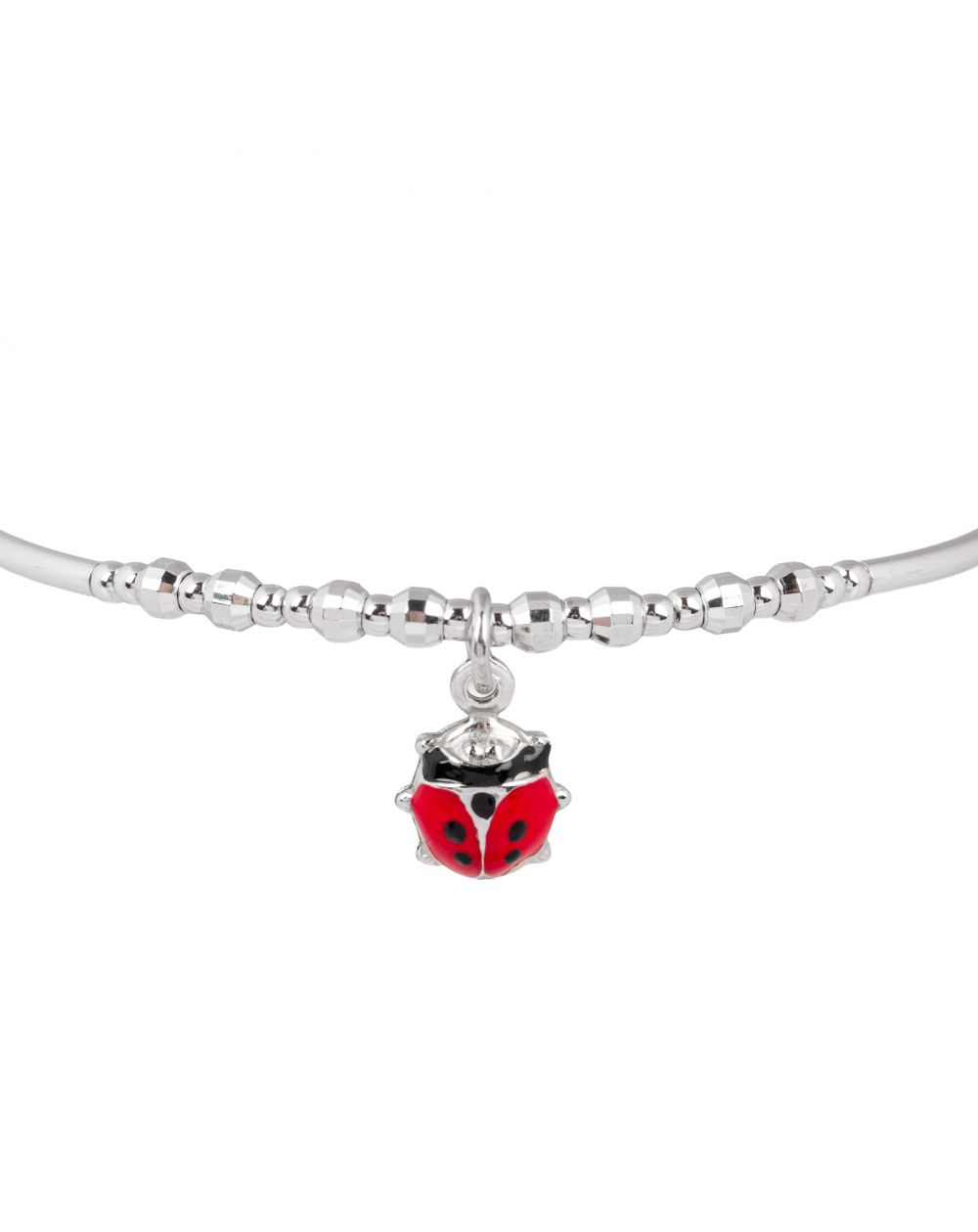 Deze kinderarmband met lieveheersbeestjes is een semi-rigide armband van 925 zilver met een geëmailleerd lieveheersbeestje van 10 mm hoog. De armband is 17 cm lang en is in lengte verstelbaar.