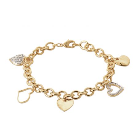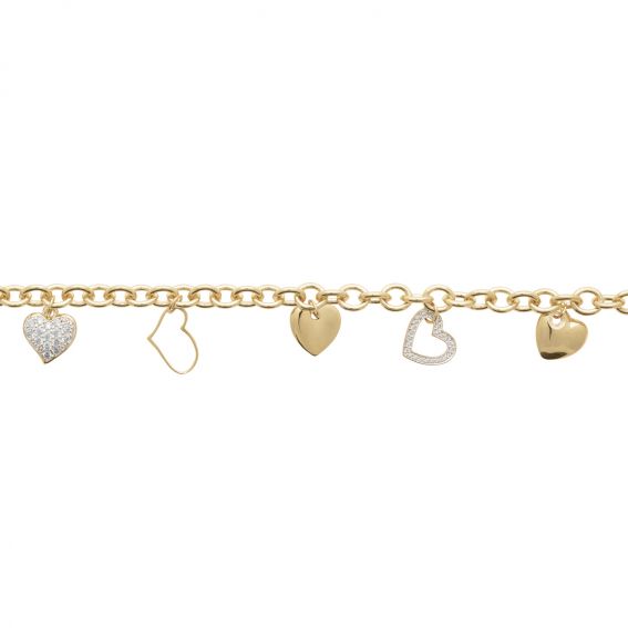 De vergulde armband onderscheidt zich door een elegante schakelketting , verfraaid met een reeks hartvormige hangers met verschillende afwerkingen: massieve harten, opengewerkte harten en harten bezet met schitterende zirkonia .