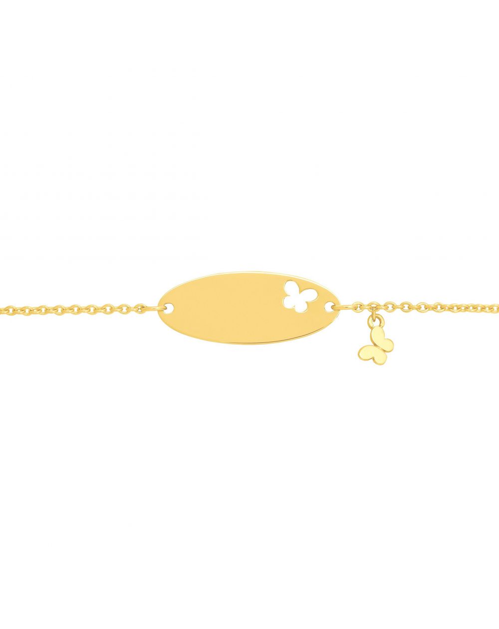 This children's number is a 9 carat gold bracelet with a small perforated plate of a small butterfly (which is recalled on the bracelet) which can be engraved with a first name and a date. This bracelet is adjustable in length (14 or 12cm).