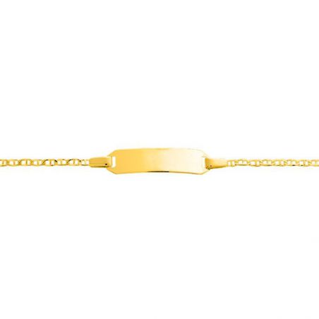 Het nummer van dit kind is een 9-karaats gouden armband met een klein rechthoekig plaatje waarop een voornaam en een datum kunnen worden gegraveerd op een marineblauwe mesh-ketting. Deze armband is in lengte verstelbaar.