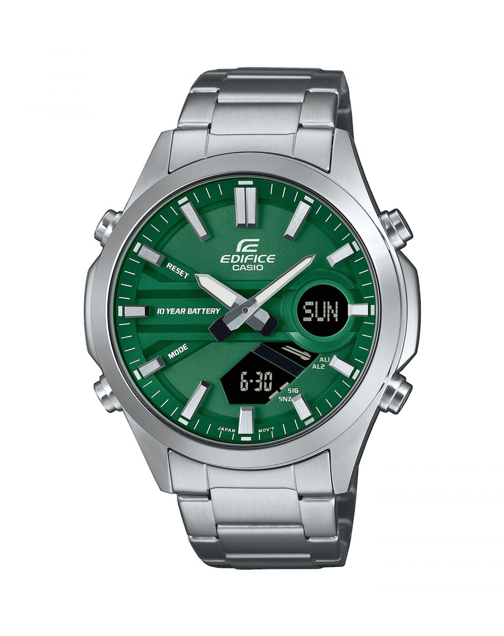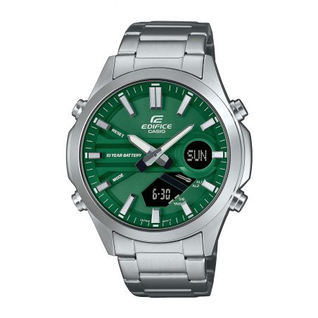Dit model uit de Edifice-serie valt op door zijn levendige groene wijzerplaat en biedt een elegante en dynamische uitstraling. De combinatie van analoog en digitaal display, evenals de robuustheid en duurzaamheid van het horloge, maken het een ideale keuze voor dagelijks gebruik en bieden tegelijkertijd een vleugje verfijning en moderniteit.